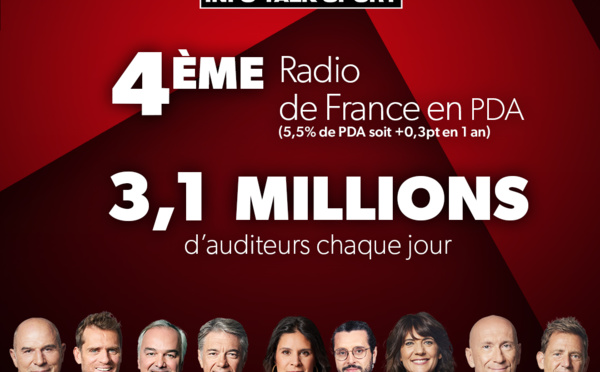 RMC augmente sa part d’audience (5.5% soit + 0.3 point en un an) et conforte sa place de 4e radio de France. La radio réunit 3 143 000 d’auditeurs chaque jour et augmente sa durée d’écoute en un an (1h48 par jour, soit une hausse de 4 minute). La marque RMC réaffirme également sa puissance en audio digital et en TV.