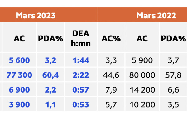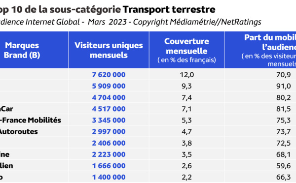 Dans une actualité marquée par les grèves, les sites et applications dédiés au transport terrestre atteignent en mars leur plus haut niveau historique : 26.9 millions d’internautes ont visité cet univers au cours du mois, soit 13% de plus qu’il y a un an. Cela représente plus de 4 Français sur 10 (42.4%). Parmi eux, 4.3 millions de visiteurs uniques ont consulté cette catégorie chaque jour, soit près d’un tiers de plus (+31%) qu’en mars 2022.