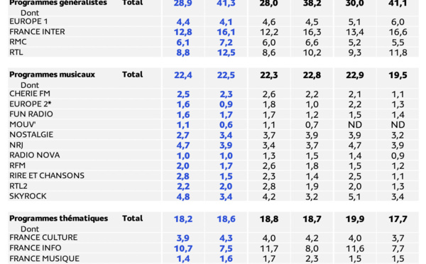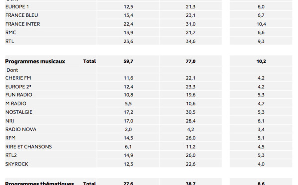 Les antennes radio du service public encore et toujours massivement choisies par les Français tant sur le linéaire que sur le numérique. Plus de 7 millions d’auditeurs écoutent France Inter (du jamais vu pour la radio) et plus de 15 millions d’auditeurs écoutent l'une des 7 stations de Radio France. Cela représente une stratosphérique PDA de 30.3%.