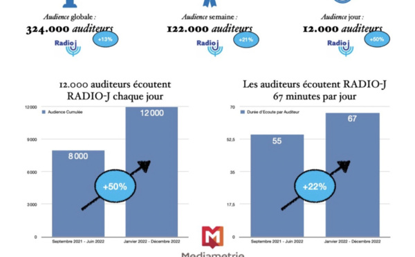 Avec une diffusion élargie en Île-de-France grâce au DAB+, et malgré ""un partage très contraignant de la fréquence 94.8 avec deux autres marques radios, la forte attractivité du programme généraliste de RADIO-J lui permet de conserver et développer "sa place incontestable de leader des audiences des radios juives en France".