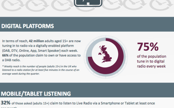 Les derniers chiffres RAJAR ont confirmé des audiences record pour la radio commerciale avec 37.2 millions d'auditeurs par semaine au 1er trimestre 2022. C'est d'ailleurs la première fois que l'audience totale de la radio commerciale dépasse les 37 millions, sa précédente audience la plus élevée étant de 36.8 millions au troisième trimestre 2021.