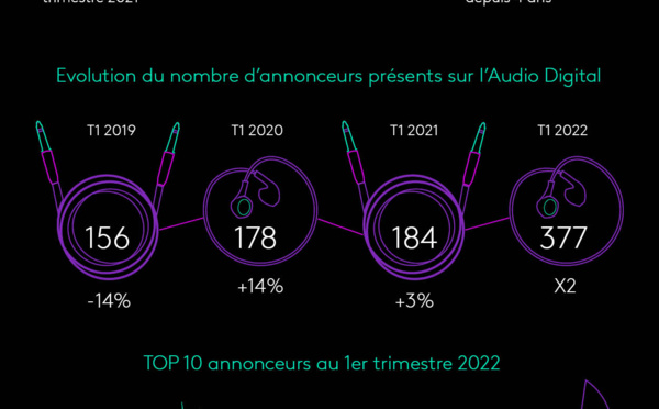 Le portefeuille du média compte 2 fois plus d’annonceurs ce trimestre selon le dernier baromètre Kantar de l'audio digital qui témoigne également d'une marché moins concentré en 2022 où le top 10 réalise 34% de l’activité versus 47% en 2021.