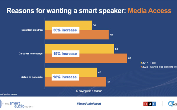 Le rapport Smart Audio 2022 présente l'omniprésence de la technologie vocale aux États-Unis. Il met en évidence l'utilisation accrue de la technologie vocale ainsi que le comportement des consommateurs sur les appareils. Aux États-Unis, 62% des Américains de 18 ans et plus utilisent un assistant vocal sur n'importe quel appareil, y compris les enceintes connectées, les smartphones ou les systèmes embarqués et plus encore.