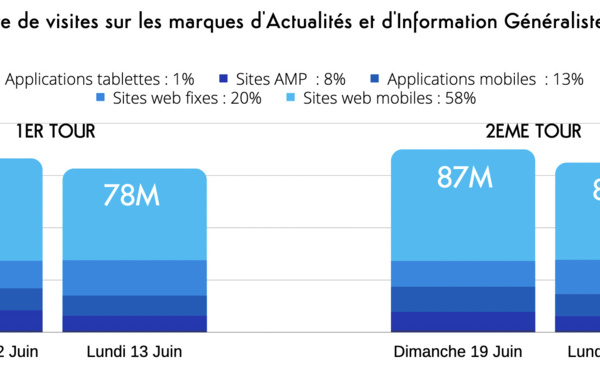 82 millions de visites quotidiennes ont été enregistrées sur les sites et applications d’actualités et d’Information généraliste à l’occasion des deux tours d’élections législatives (les dimanches et les lundis des 2 tours), soit une progression de 31% par rapport à la moyenne des 5 dimanches et lundis d'avant les élections.