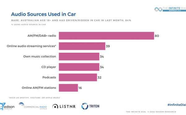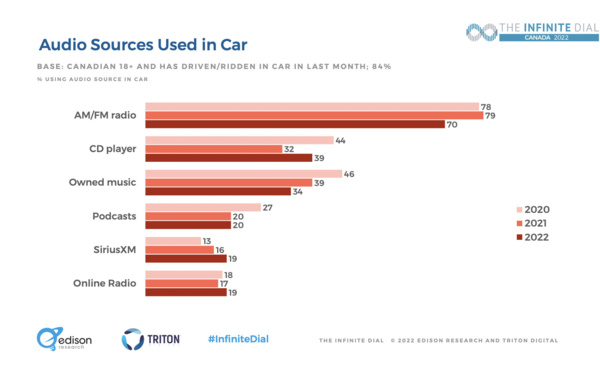 Si la radio AM/FM est encore utilisée par la plupart des Canadiens comme source audio embarquée, elle a néanmoins cédé du terrain face à l'audio numérique. Globalement, davantage de Canadiens écoutent de l'audio en ligne en 2022 et pas seulement et uniquement en voiture selon la dernière étude Infinite Dial Canada..