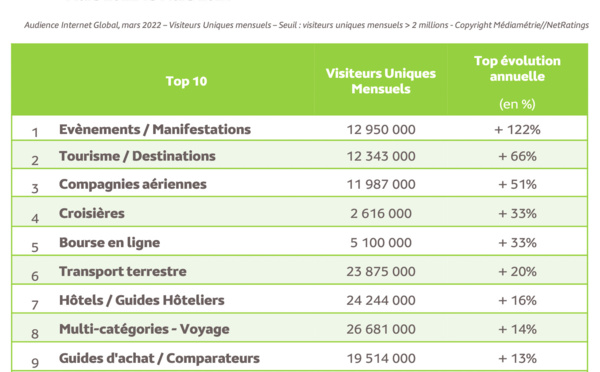 En mars, période d’allégement des restrictions, les sites liés au tourisme, aux événements et aux transports sont ceux qui ont connu la plus forte croissance avec en tête, la catégorie "Événements & Manifestations" en hausse de 122% par rapport à 2021.