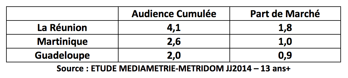 L'enquête a été menée dans les départements d’Outre-Mer en Guadeloupe, en Martinique et à La Réunion, dans la période comprise entre janvier et juin 2014 (du 13 janvier au 15 juin). A noter la très forte progression à La Réunion, où l'Audience Cumulée bondit à 4,1 (+ 17% sur un an et + 20% sur la vague).