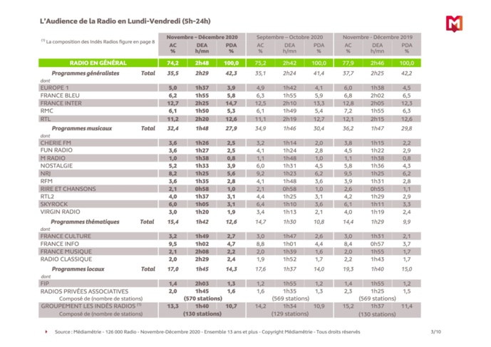 Seule France Info et quelques thématiques tirent profit de la situation. Seuls l’info en direct et l’accompagnement thématique recueillent les faveurs des nouveaux usages de la consommation radio.