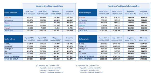 Cette même tendance à la hausse est également observable en nombre d’auditeurs quotidiens et hebdomadaires, indicateurs très importants sur lesquels la RTBF reste également à nouveau globalement leader avec une moyenne 2014 également la meilleure qu’elle ait réalisée.