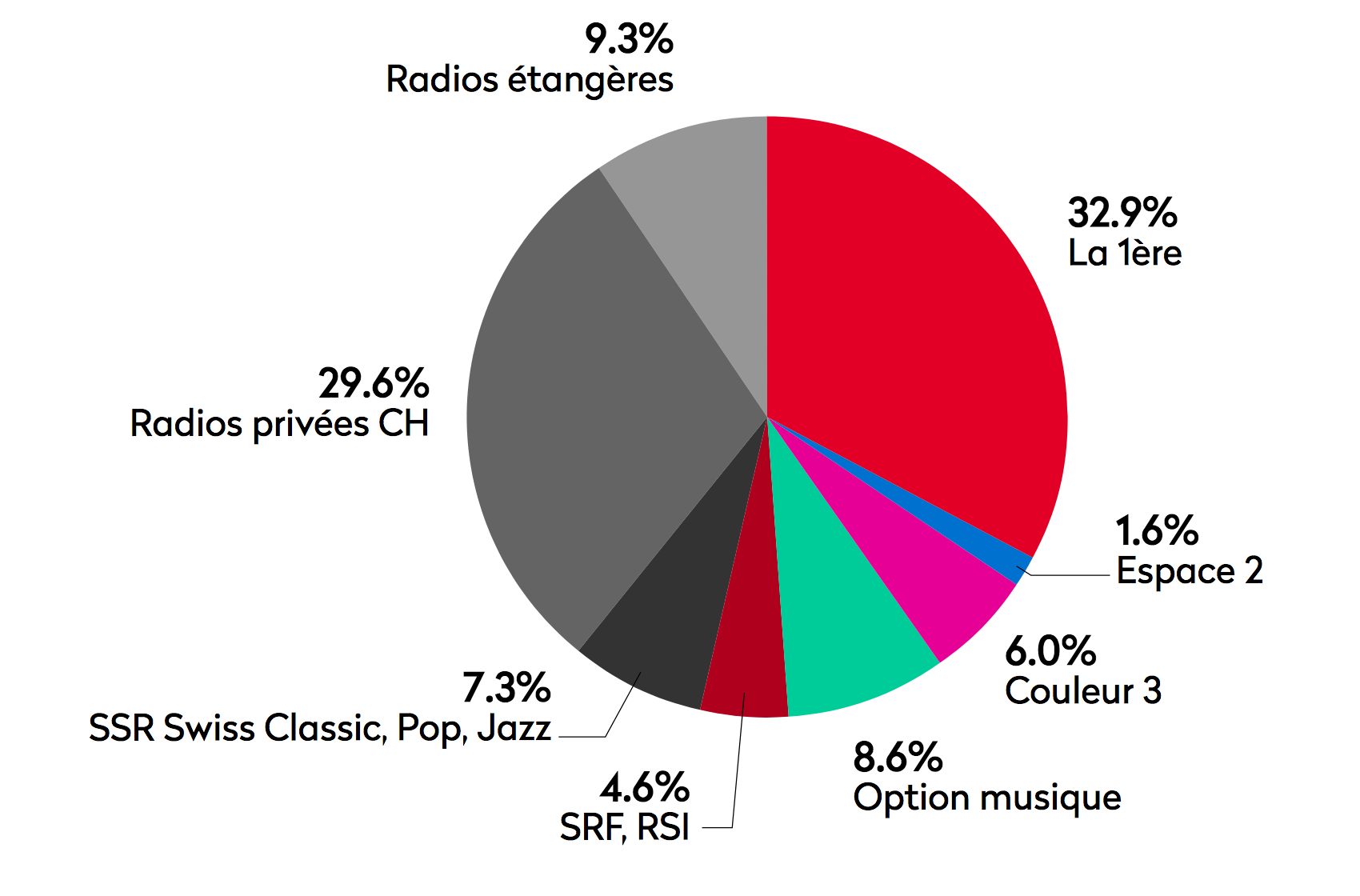 49.1% de l’audience sur les chaînes de la RTS © MediaPulse Radio Data (EvogeniusReporting), Suisse romande, 15 ans et + (1 732 300 personnes)