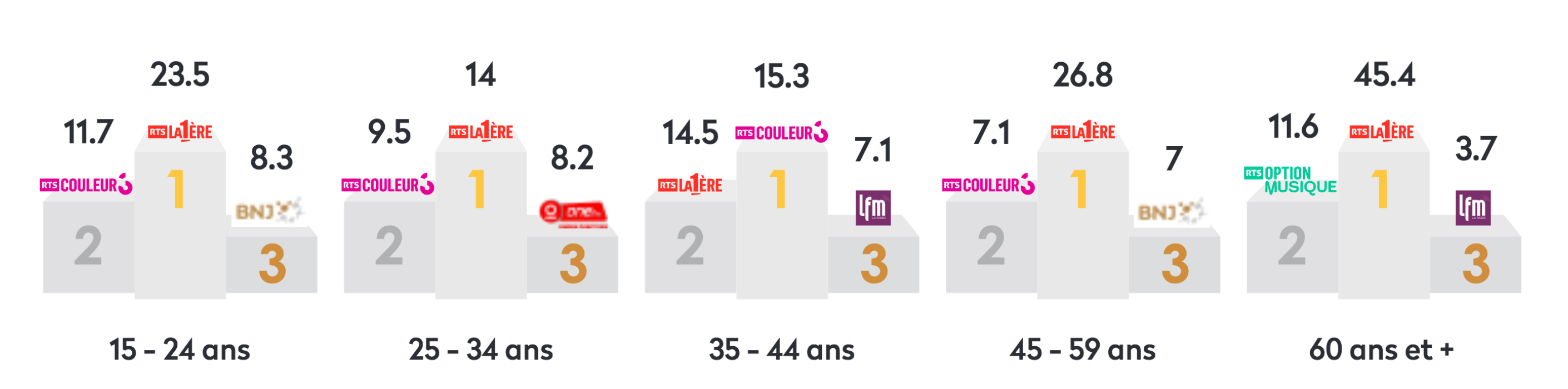 La RTS en tête dans toutes les tranches d’âge © MediaPulse Radio Data (EvogeniusReporting), Suisse romande, 15 ans et + (1 732 300 personnes)