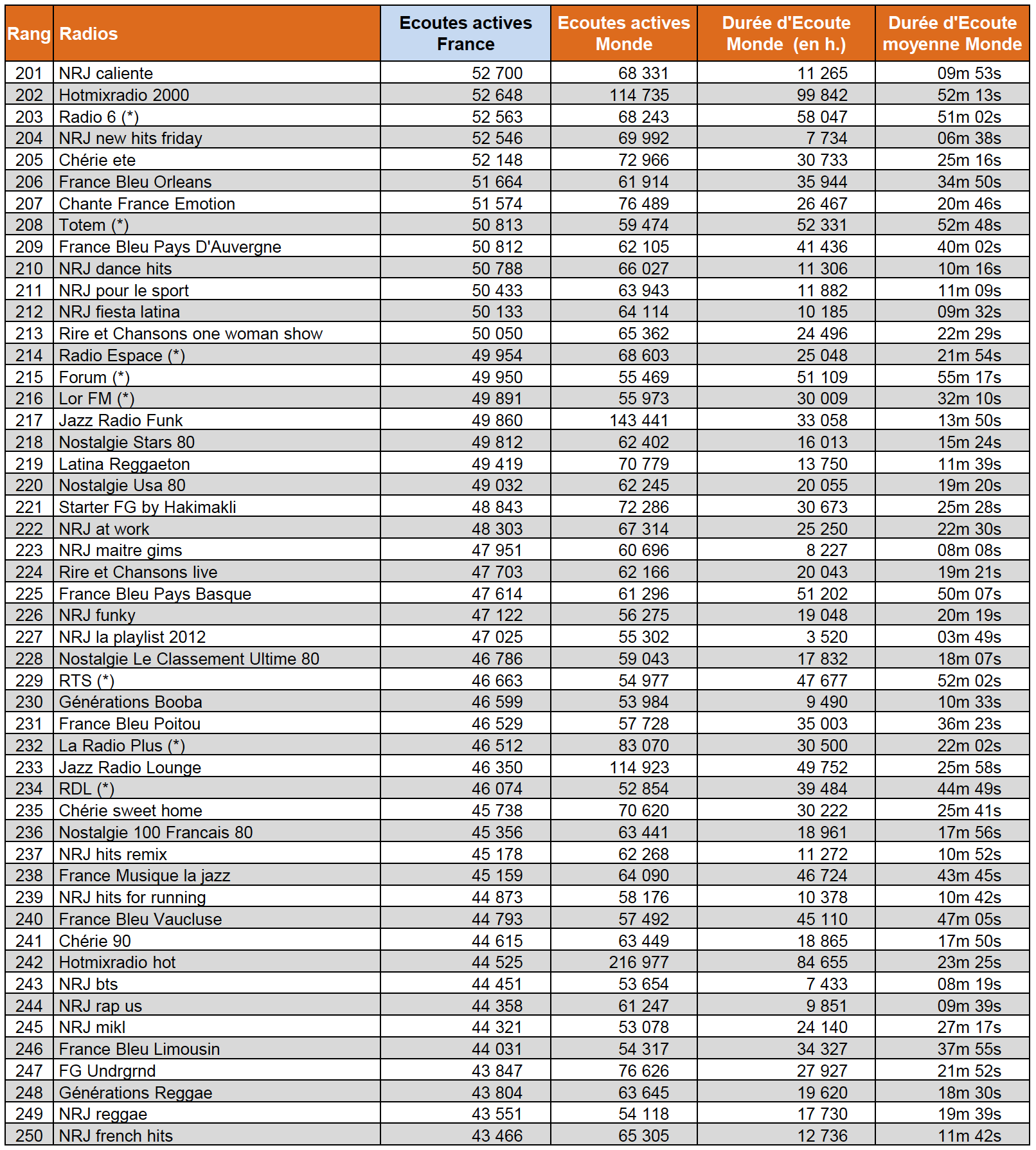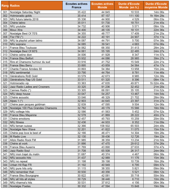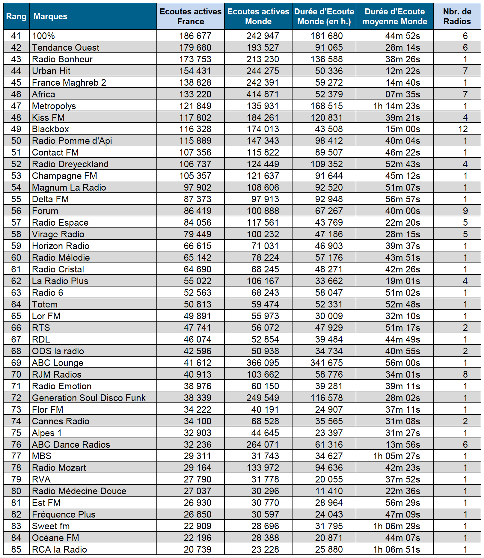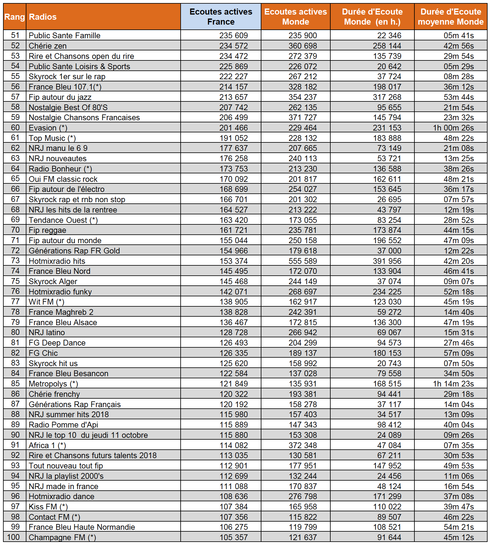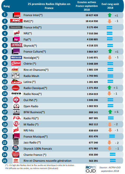 Poids lourds du classement : Radio France qui a enregistré, avec 70 flux différents en septembre, plus de 42 millions d'écoutes actives depuis la France et Radionomy, qui avec 9 259 flux, a généré près de 230 millions d'écoutes actives à l'international.