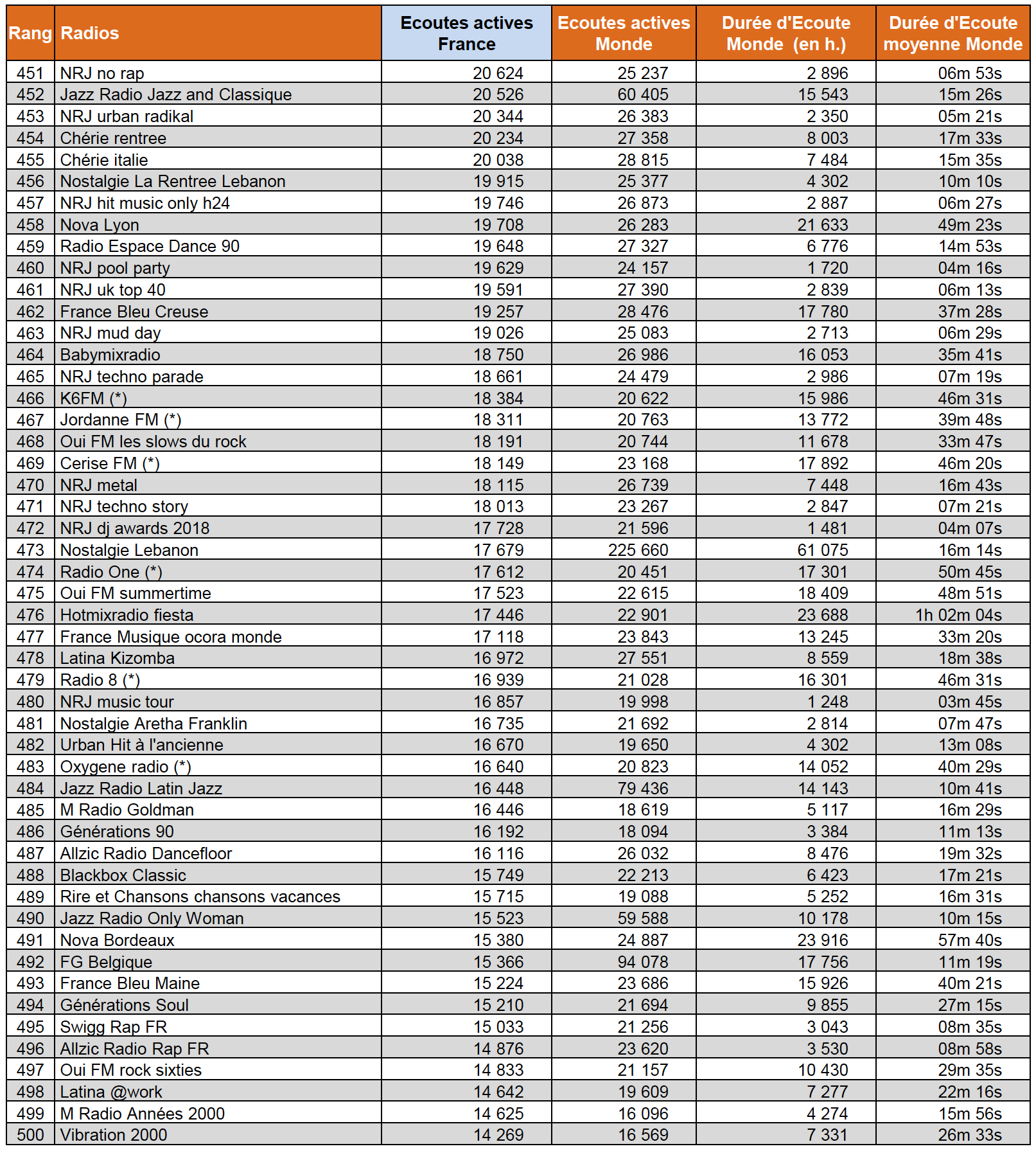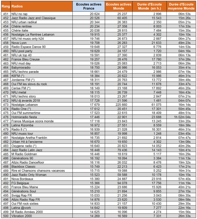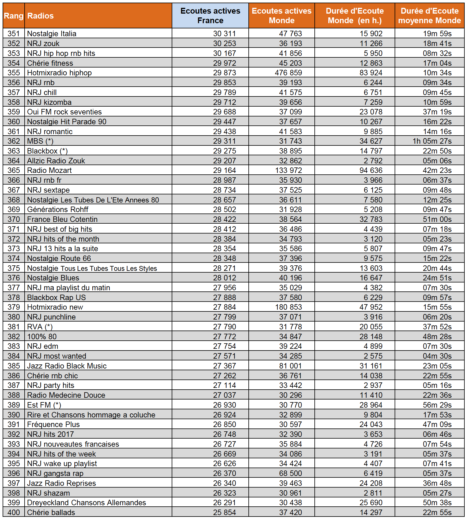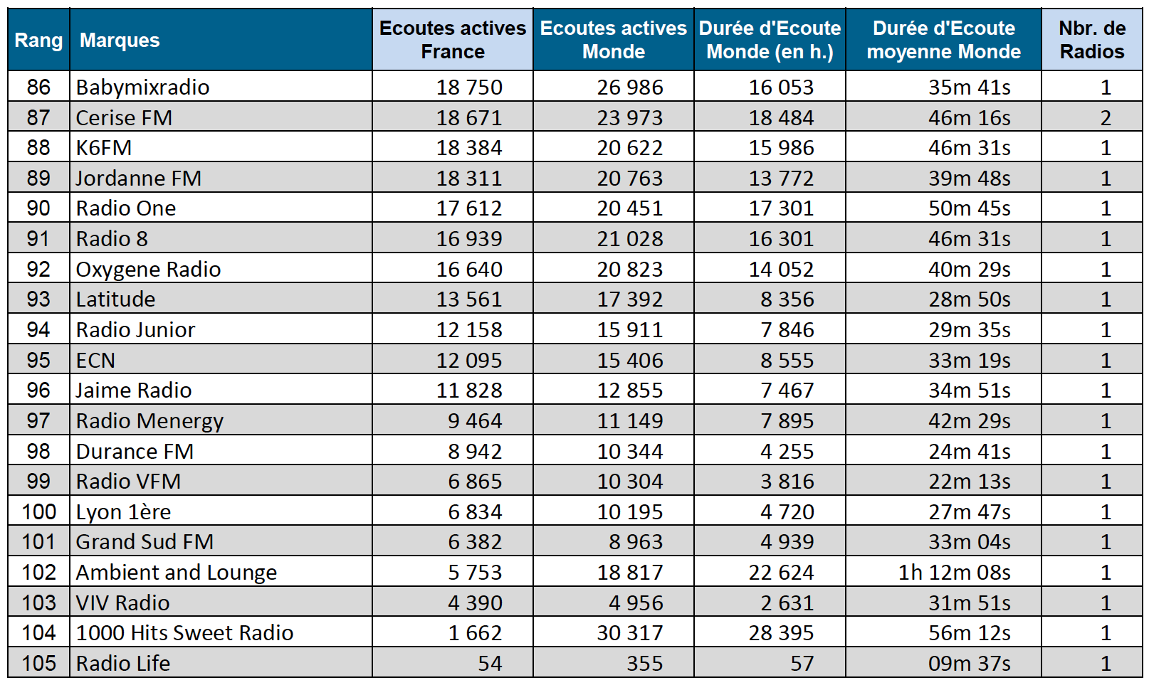 Poids lourds du classement : Radio France qui a enregistré, avec 70 flux différents en septembre, plus de 42 millions d'écoutes actives depuis la France et Radionomy, qui avec 9 259 flux, a généré près de 230 millions d'écoutes actives à l'international.