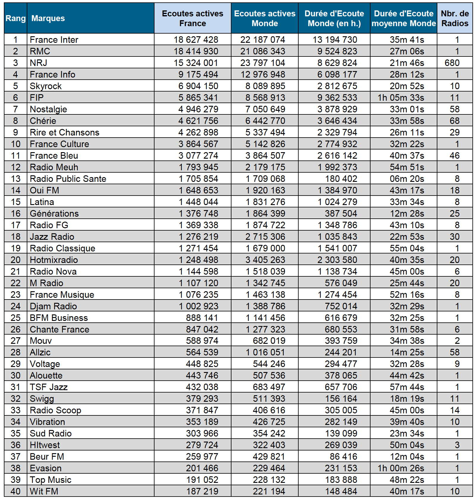 France Inter (18 627 428 écoutes actives) a donc gagné une place au dernier classement mensuel de l'ACPM. Elle enregistre une durée d'écoute de 35 min 41 et devance désormais, d'une courte tête, RMC, (16 414 930 écoutes actives) elle-même suivie par franceinfo (9 175 494 écoutes actives). NRJ, à la 4e place, reste néanmoins solide (7 310 266 écoutes actives) tout comme FIP, à la 5e place (4 330 805 écoutes actives). Dans le reste de ce classement, seules Radio Classique et BFM Business sont en hausse. Radio Meuh et Djam Radio se maintiennent très correctement au milieu des mastodontes. Soulignons la présence de 3 flux dans le Top 25, flux différents du flux premium : "Rire & Chansons Nouvelle Génération", "Skyrock 100% Français" ainsi que NRJ Hits.