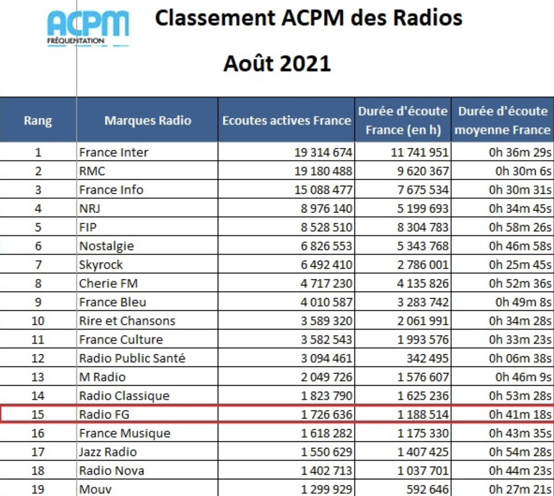 La marque FG est la 15e marque radio digitale en France avec 1 726 636 écoutes actives en France. Le programme Radio FG est 21e radio du classement. Radio FG totalise une audience de 738 467 écoutes actives en France, 922 118 dans le monde, avec une durée d'écoute moyenne de 48 min. FG Chic prend la 58e place du classement. Le programme totalise une audience de 295 823 écoutes actives en France, 283 988 dans le monde, avec une durée d'écoute moyenne de 48 min. Deux radios de la marque FG se distinguent particulièrement : FG Deep Dance (67e) et FG Starter by Hakimakli (88e) qui se classent parmi les 100 premières radios. Le succès de Maxximum se confirme : relancée en mai 2020 avec un format alternatif et underground, la marque mythique Maxximum se classe 126e.