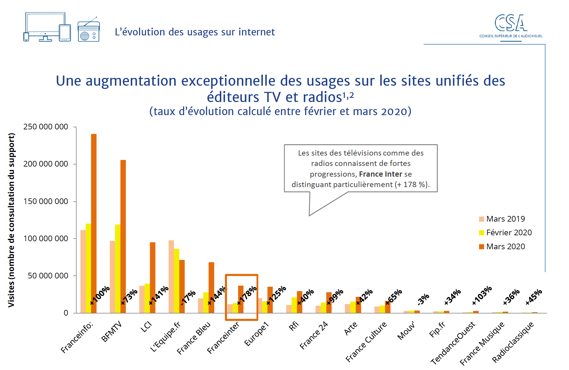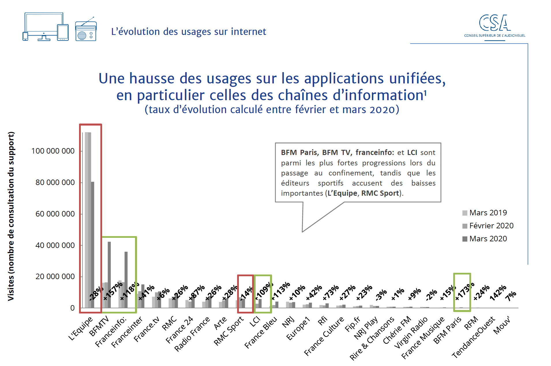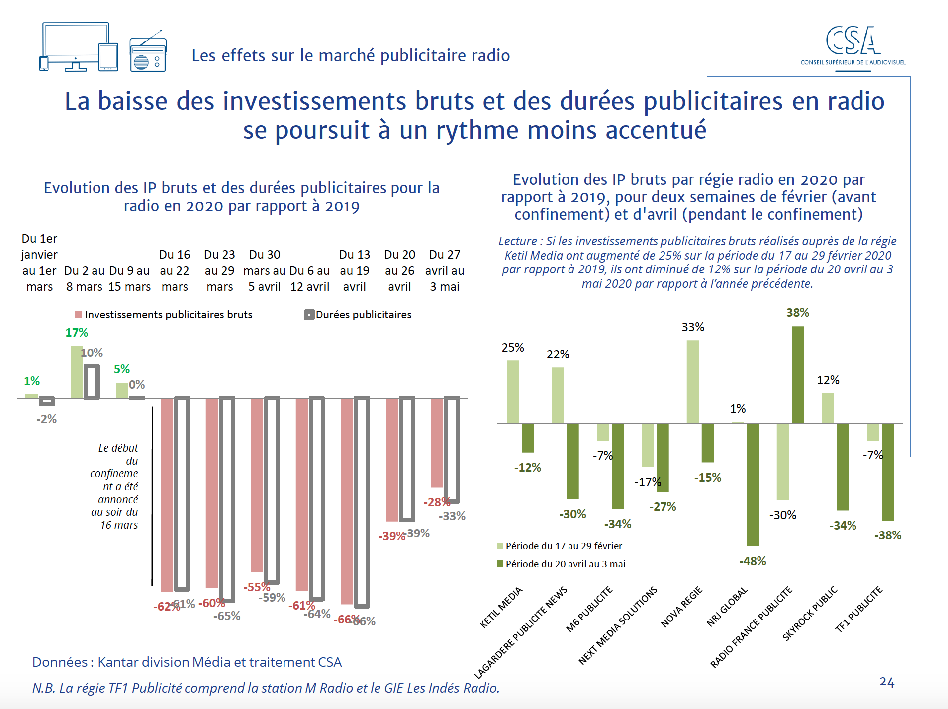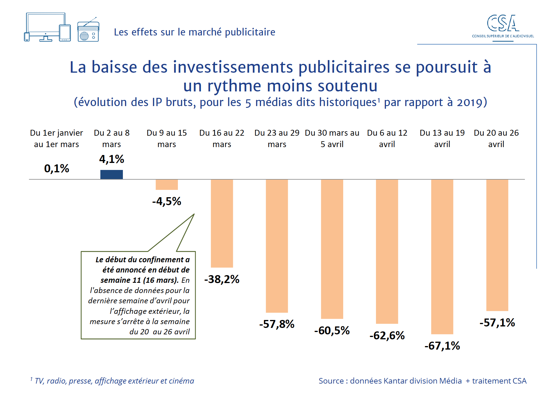 Les acteurs audiovisuels se trouvent face à un paradoxe, n’ayant pour beaucoup jamais réuni de tels niveaux d’audience, mais rencontrant de lourdes difficultés économiques, potentiellement au-delà de la période d’état de crise sanitaire, en lien avec la contraction des investissements publicitaires" rappelle le CSA.