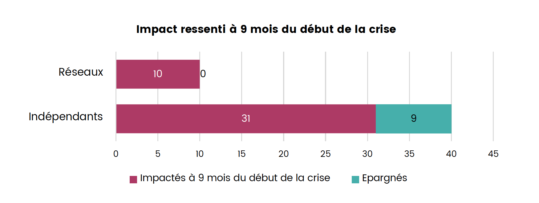 Les acteurs nationaux ont pu sauvegarder une partie importante de leur chiffre d'affaires et limiter la casse grâce à la reprise de la publicité à l’échelle nationale dans la deuxième moitié de l’année. A contrario, le marché de la publicité locale et ultra-locale s’est totalement effondré pendant la période mesurée, au détriment des radios indépendantes principalement. En outre, les radios indépendantes tirent normalement une partie significative de leurs revenus de l’organisation d’événements locaux ou de partenariats sur l’organisation d’événements. L’arrêt complet du secteur événementiel les impacte donc au premier plan, faisant disparaître une seconde source de revenus. En conséquence, les déclarations des sondés indiquent une réduction moyenne du chiffre d’affaires des radios indépendantes de 62% et 25% pour les radios en réseau.