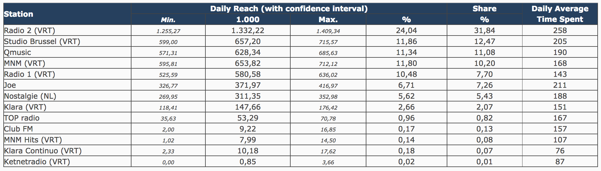 Sur le marché francophone, 4 stations sont au coude à coude : Bel RTL (14.11), Radio Contact (14.01), VivaCité (13.51) et Nostalgie (13.05). Suivent Classic 21 et La Première (deux radios de la RTBF comme VivaCité) puis NRJ Belgique, Pure FM, Fun Radio Belgique Musiq'3, DH Radio, Mint et Chérie (qui est seulement diffusée sur le digital). Rappelons que la dénomination "Average daily Reach" correspond au nombre d’auditeurs en milliers ou en pourcentage faisant partie de l’univers 12 ans et plus ayant écouté la station concernée pendant au moins un quart d’heure un jour moyen du lundi au dimanche. Le "Market share" renvoie à la part de marché de la station concernée dans le volume global d’écoute de la radio sur l’univers 12 ans et plus.