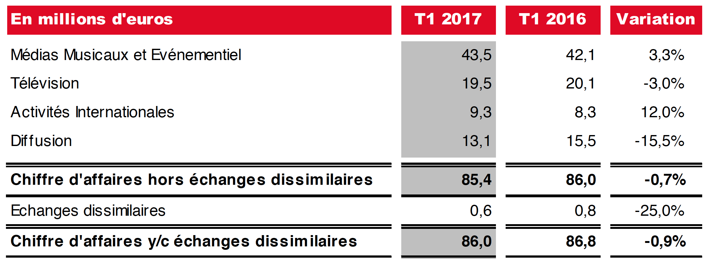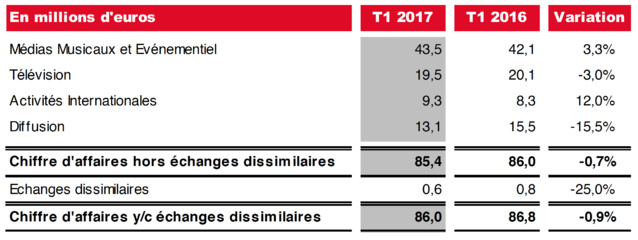Sur les 3 premiers mois de l’exercice 2017, le chiffre d’affaires du pôle Médias Musicaux et Événementiel progresse de 3.3% à 43.5 M€. Au premier trimestre 2017, les activités radios du groupe NRJ affichent une croissance de 1,3%. Fort de son positionnement unique national/local et de sa puissance sur les Millennials, le Groupe enregistre ainsi sur son activité principale une croissance significative sur le plan local et une surperformance par rapport au marché sur le plan national.