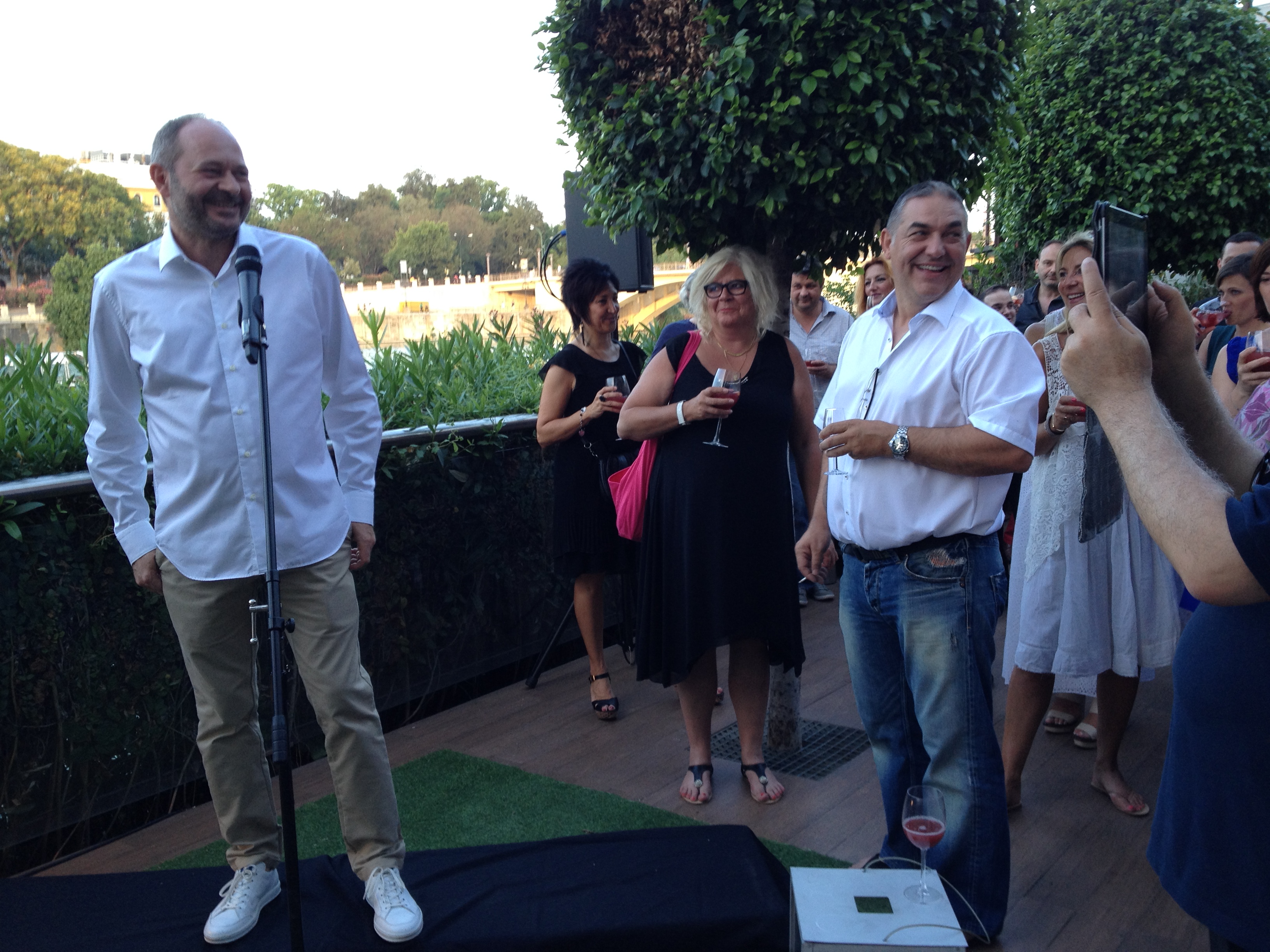 Le dîner de gala, au bord du Guadalquivir. Le président Valli a remercié l'équipe d'organisation, au premier rang desquels Frank Levis et Géraldine Beguin. On n'imagine pas la somme de petits détails et de grosses questions stratégiques qu'il faut anticiper et régler pour emmener... plus de 120 radios en Espagne.