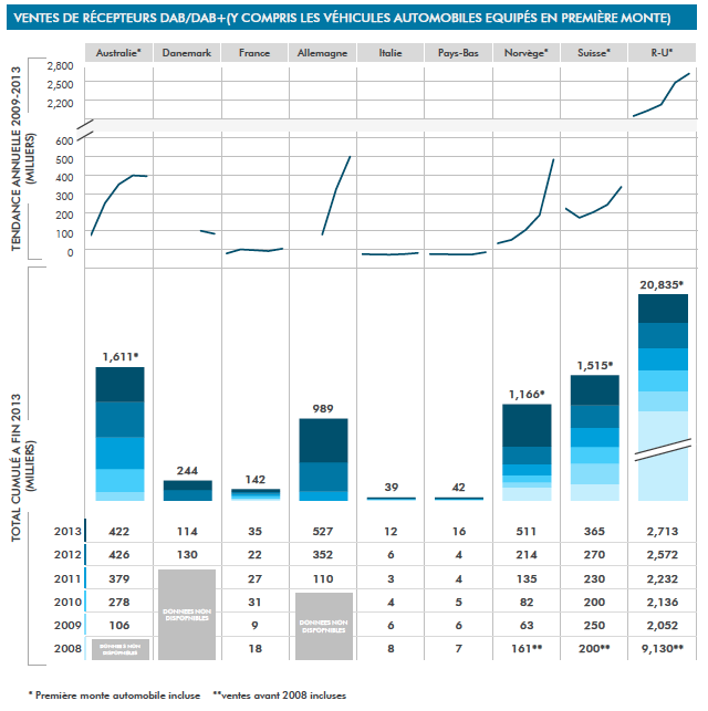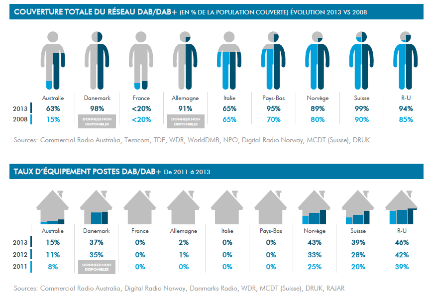 Le titre de TVB Europe est explicite : "la radio numérique terrestre explose dans le monde". TVB Europe reprend les chiffres des officiels rapportés par le WorldDMB pour arriver à cette constatation sans appel. Les taux de couverture sont très parlants : 99% en Suisse, 98% au Danemark, 95% au Pays-Bas ou encore 94% au R-U et 91% en Allemagne. Le taux d’équipement n’est pas en reste ni le taux d’écoute. On enregistre une croissance des ventes de récepteurs de 35 à 139% dans les principaux pays.