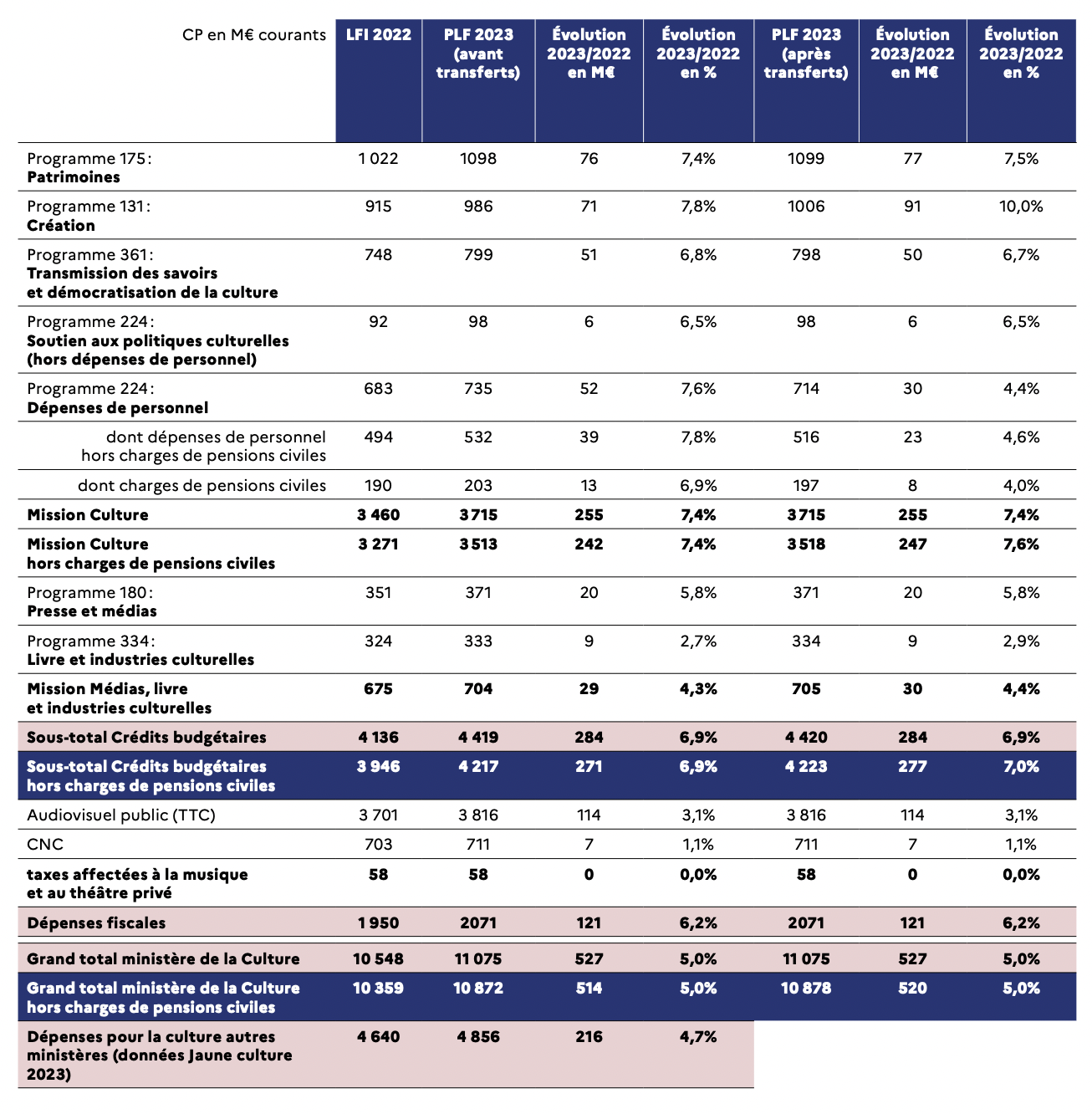 Les budget 2023 du ministère de la Culture est téléchargeable ICI.