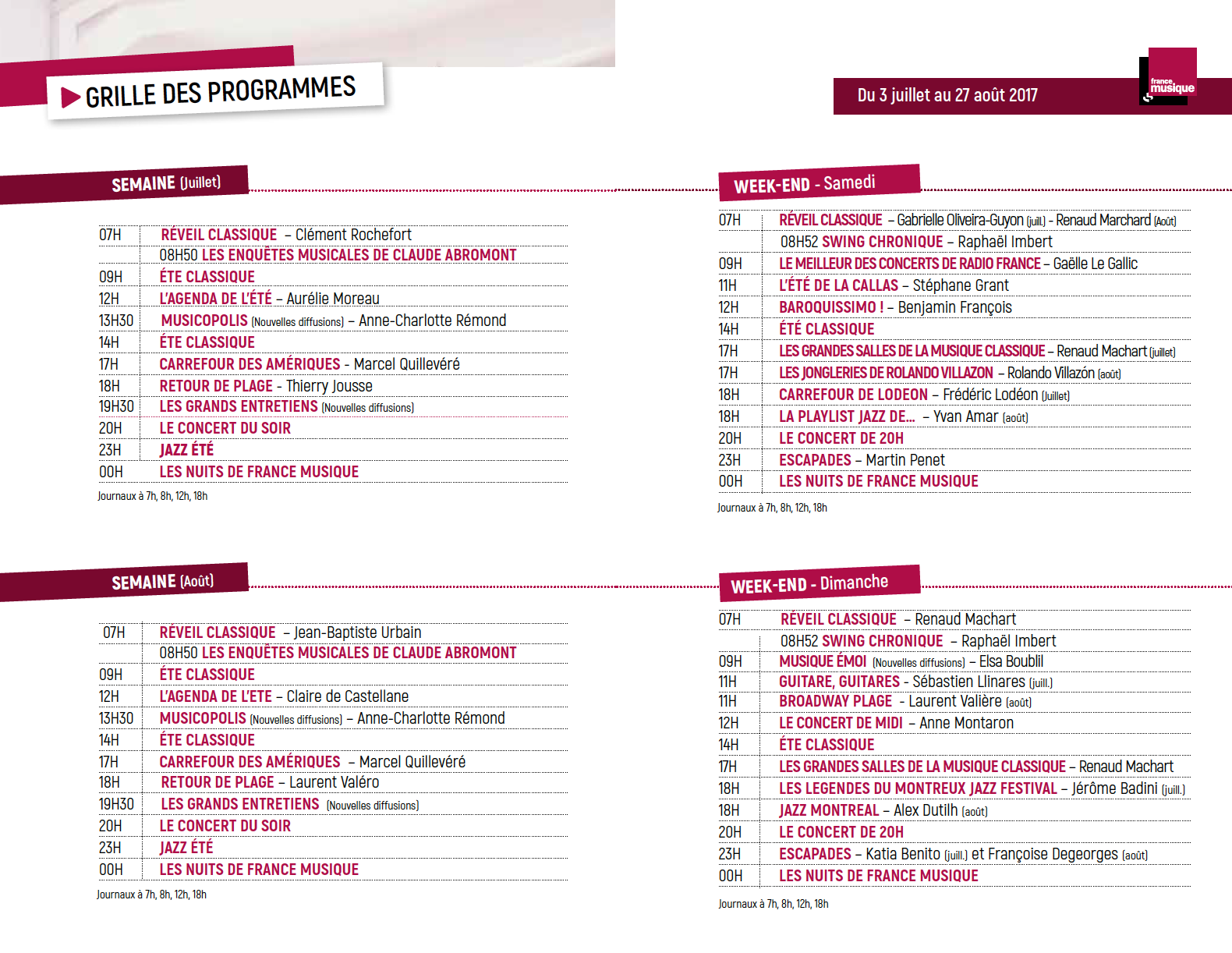 Cet été encore, France Musique prend la route des festivals et part sillonner la France. Au programme : des émissions en public et en direct des plus grands événements : les chorégies d'Orange (avec plusieurs captations en direct) ou encore le festival d'Aix-en-Provence (avec des émissions et des opéras en direct). Par ailleurs, France Musique mobilisera ses équipes et s’installera en direct du Festival Radio France Montpellier Occitanie, du 17 au 23 juillet. Une programmation audacieuse dont France Musique est le premier diffuseur avec au total 36 concerts enregistrés dont 27 en direct.