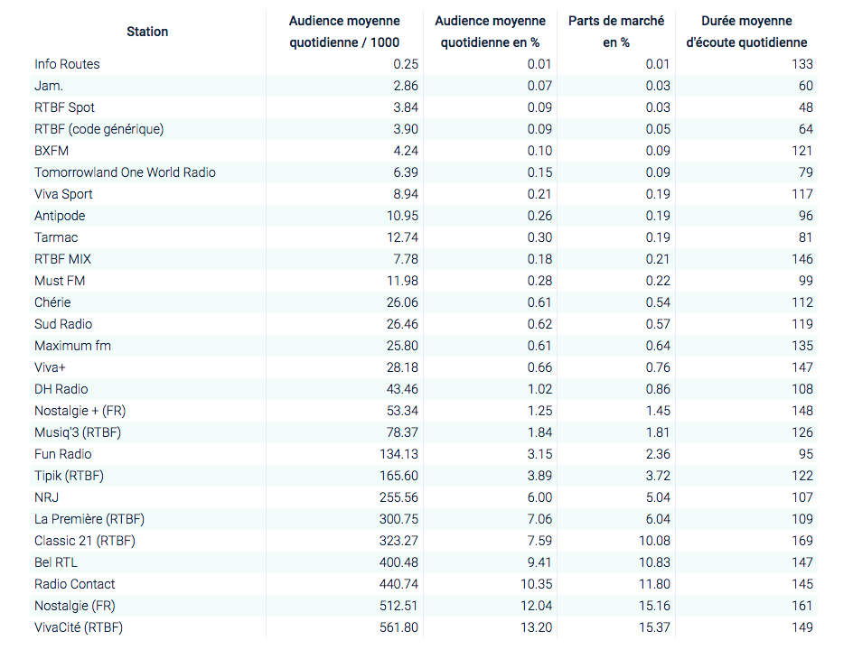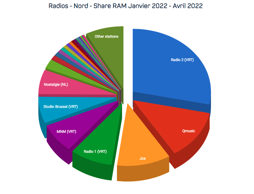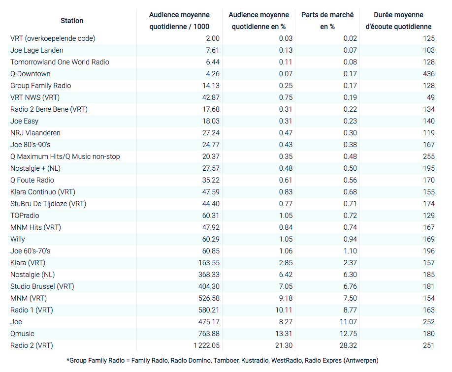 Sur le marché nord, Radio 2 (28.3%), Qmusic (12.7%), Joe (11.0%), Radio 1 (8.8) et MNM (7.50%) sont les plus écoutées.