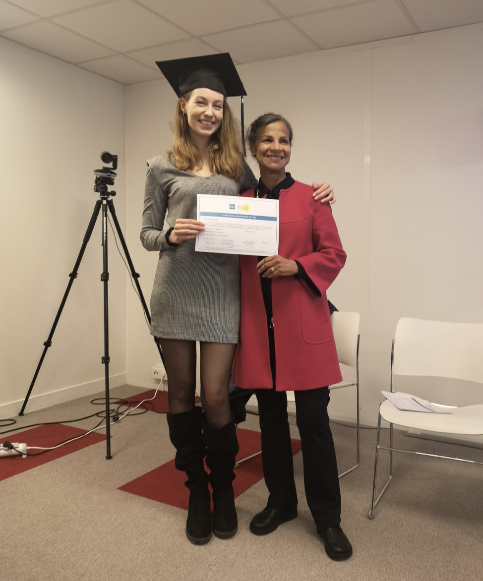 Kheira Berger a appelé un à un les stagiaires du CQP Animateur radio de la promotion 2021-2022 pour recevoir leur diplôme. En récompensant Caroline du titre honorifique de major. Elle a devancé de peu Lucie, et Florence. Les applaudissements les plus nourris ont aussi accompagné André-François, le doyen de la promotion. La relation conviviale du musicien reconverti de 58 ans avec la benjamine du groupe Alexiane, 22 ans, témoigne de l’état d’esprit bon enfant qui caractérise cette promotion. Des origines, parcours, ou passions si différentes, mais tous guidés par cet objectif commun.