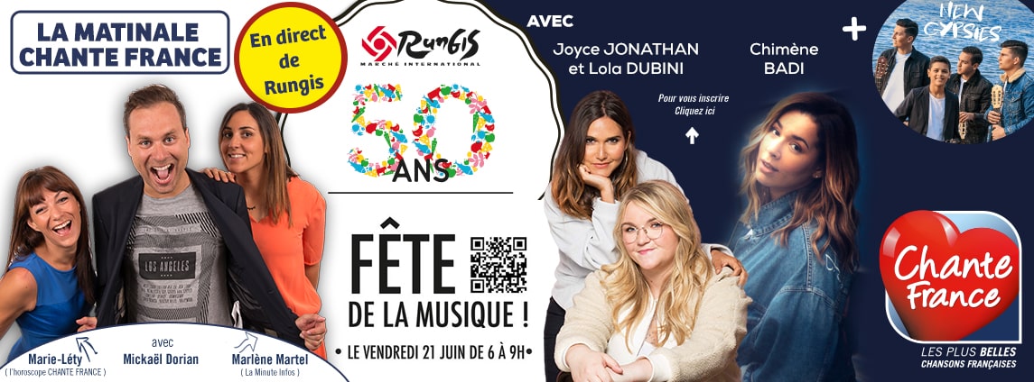 Ce vendredi 21 juin, Chante France ouvre les portes du marché de Rungis à ses auditeurs et les invite à participer à la Fête de la Musique "la plus tôt de France". Seront présent, dès potron-minet, Joyce Jonathan, Chimène Badi, les New Gypsies, Marc Fichel et beaucoup d'autres.