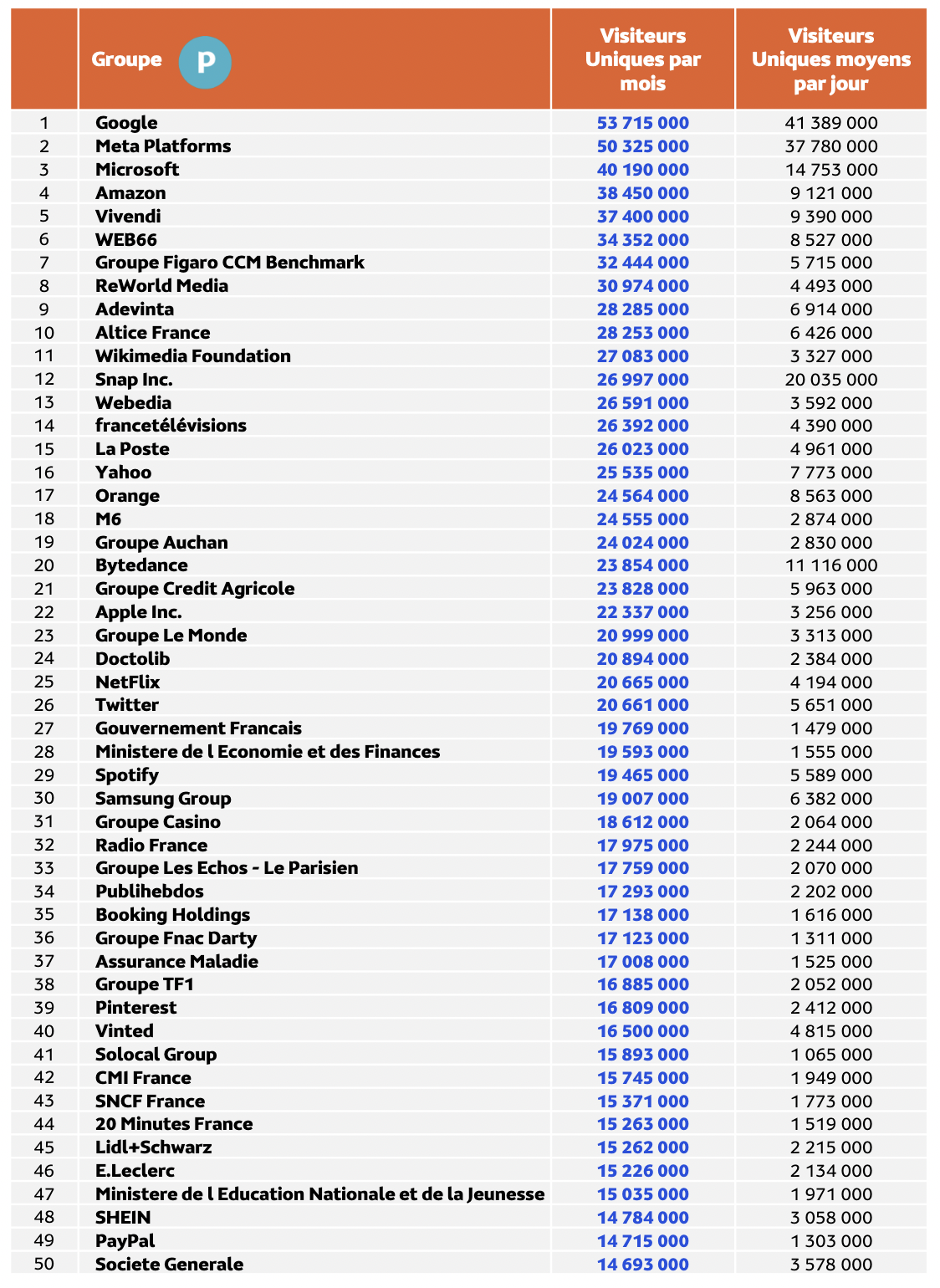 Top 50 des groupes les plus visités en France