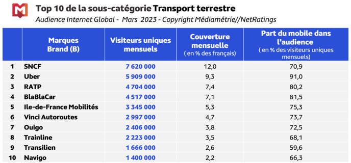 Le nombre de visiteurs utilisant leur mobile pour accéder à ce type de services a progressé de 3,3 millions en un an, pour atteindre 22.2 millions d’individus, soit une évolution de +18%. Plus de 8 visiteurs uniques mensuels sur 10 (82.4%) ont donc utilisé leur smartphone pour visiter les sites et apps de transport terrestre, et près des deux tiers (65.2%) ont exclusivement utilisé cet écran (+ 2.8 millions d’internautes vs mars 2022). Le podium des meilleures audiences illustre la diversité des acteurs de la catégorie. La suite du classement fait la part belle aux opérateurs franciliens, la période correspondant également à l’ouverture de l’espace dédommagement d’Île-de-France Mobilités pour les clients Navigo.