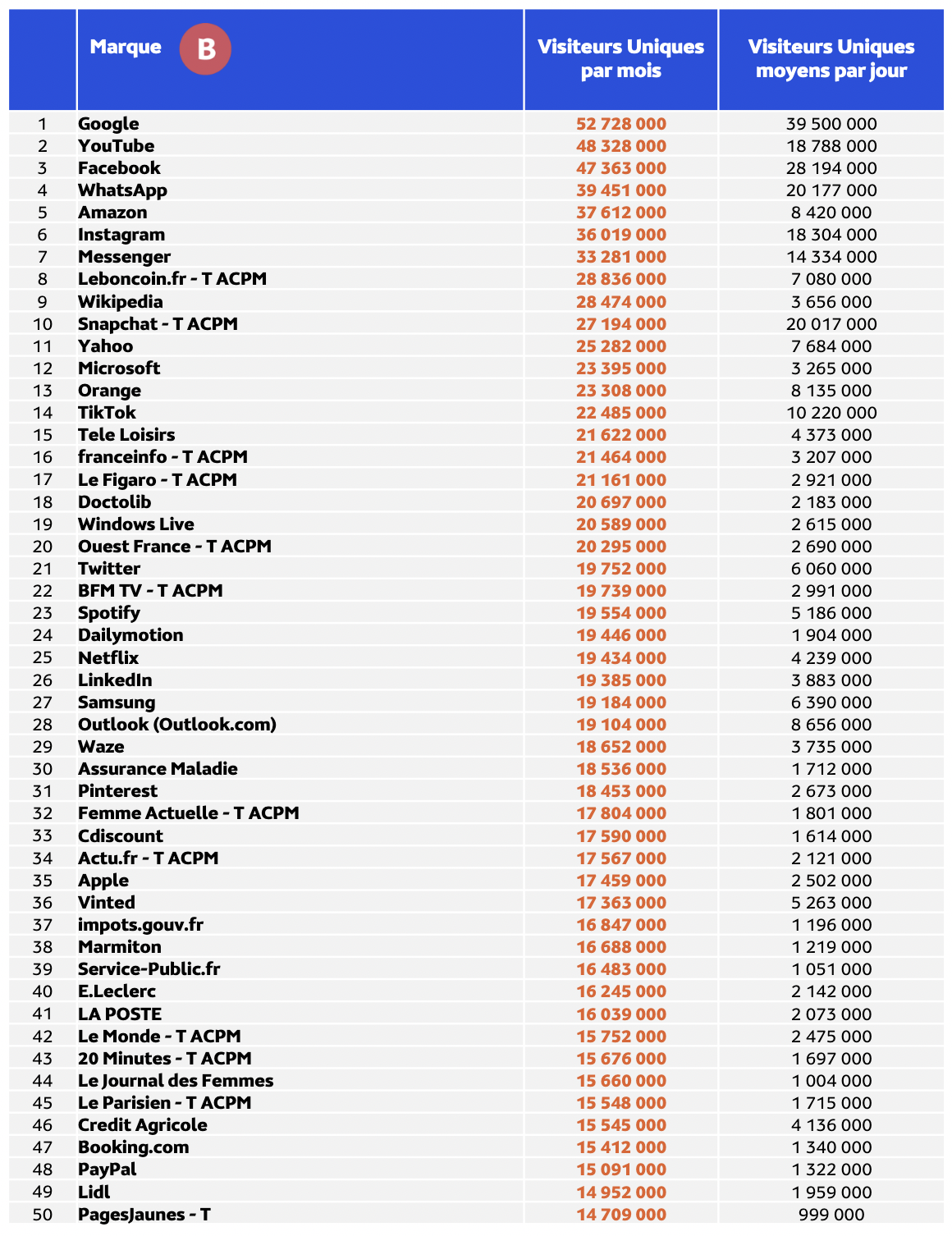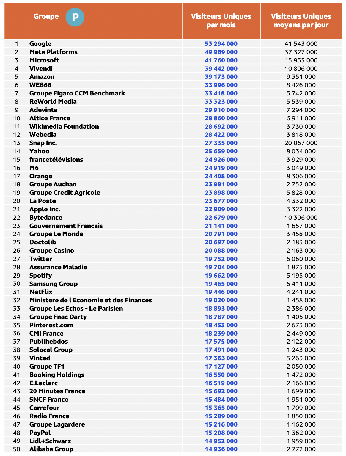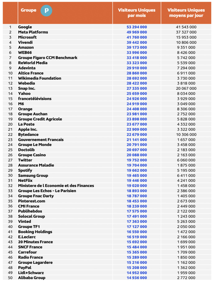 Médiamétrie et Médiamétrie//NetRatings - Audience Internet Global - Tous lieux de connexion - France - Mars 2023 - Base : 2 ans et plus Copyright Médiamétrie - Tous droits réservés