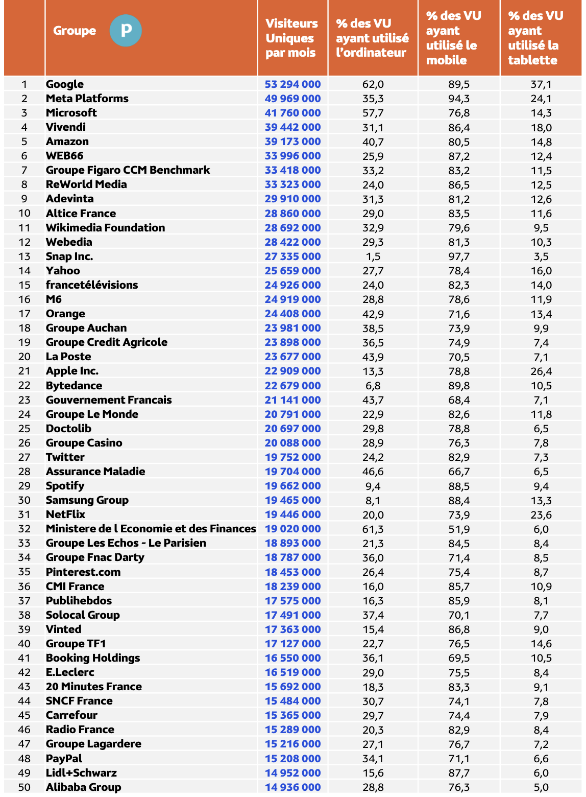 Répartition par écran Top 50 des Groupes les plus visités en France