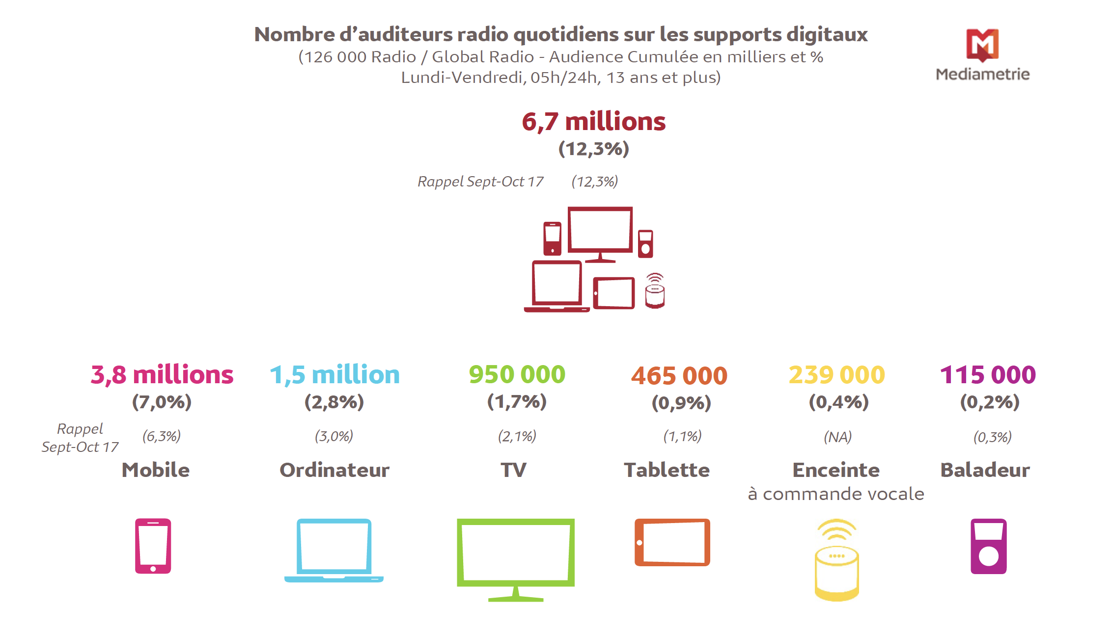 Le module Global Radio de l’enquête 126 000 Radio permet d’analyser les comportements d’écoute numérique de la radio. La nouvelle édition révèle que 12.3% des Français de 13 ans et plus, soit 6.7 millions de personnes, écoutent chaque jour la radio sur un support digital. Un niveau stable par rapport à Septembre-Octobre 2017. Le téléphone mobile reste le premier des supports numériques utilisés pour écouter la radio avec 3,8 millions d’adeptes chaque jour. Viennent ensuite l’ordinateur (1.5 million d’auditeurs), la télévision (950 000), la tablette (465 000) et le baladeur (115 000). L’étude intègre pour la première fois les enceintes à commande vocale, qui rassemblent en moyenne chaque jour 239 000 auditeurs.