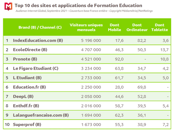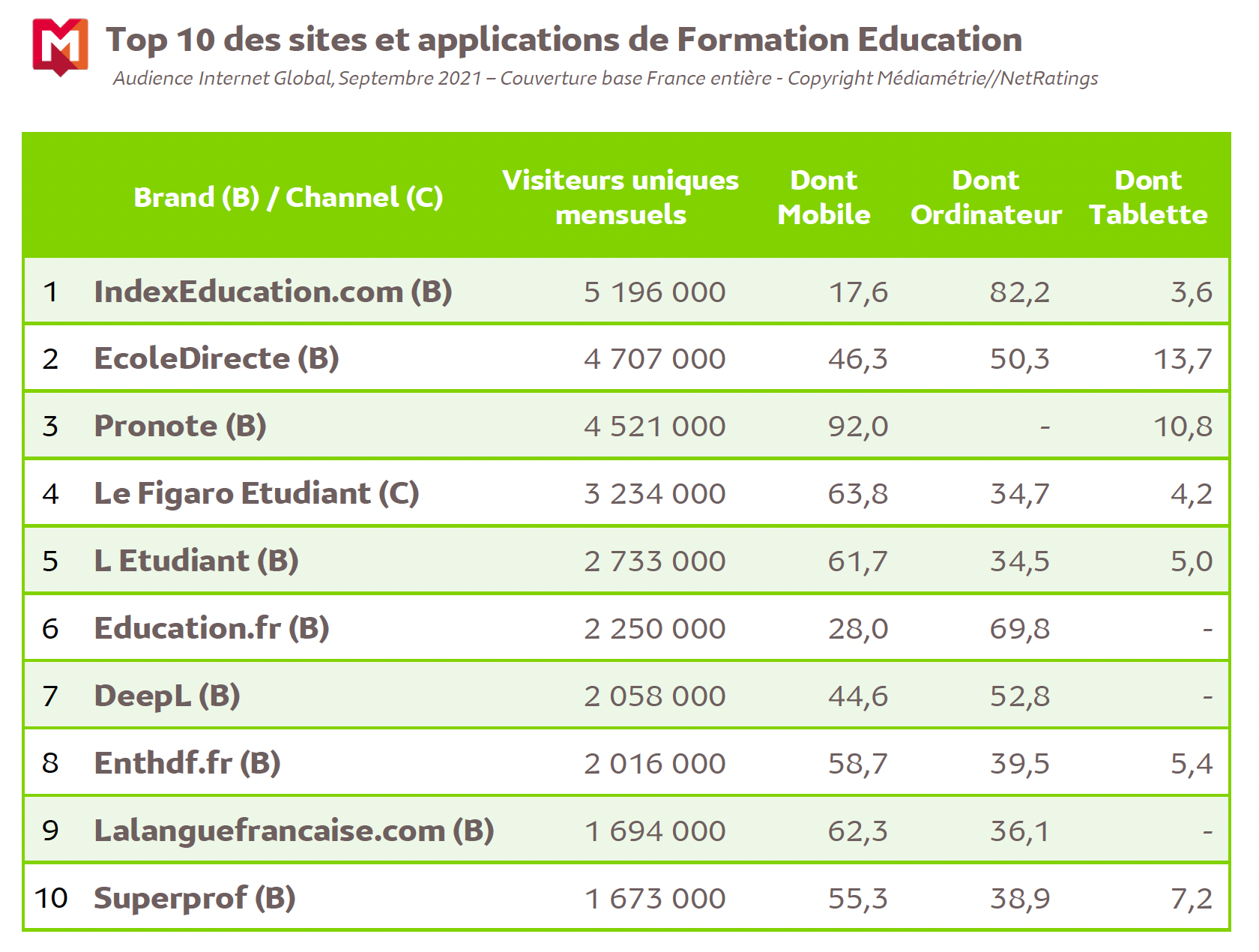 Au mois de septembre 2021, 30.8 millions d’internautes ont visité les sites et applications de Formation/Education, soit près de la moitié (48.9%) des Français âgés de 2 ans et plus. Parmi eux, 7.4 millions les ont fréquentés chaque jour (11,7% des Français). Particulièrement adeptes, plus des trois quarts (75.8%) des 15-24 ans ont visité des sites et applications de formation en septembre. Près d’1 sur 4 (23.6%) y est revenu chaque jour. Et les plus jeunes sont les plus connectés : plus d’un quart (26,5%) des 15-19 ans et 24 % des 11-14 ans les ont consultés chaque jour.