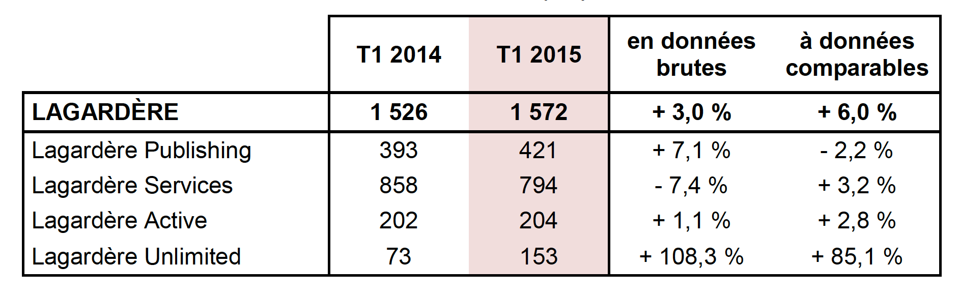 La tendance du chiffre d’affaires publicitaire est légèrement négative à - 1,8 %. Il est rappelé que le poids du 1er trimestre est faible dans le chiffre d’affaires publicitaire annuel. Le niveau d’activité des radios est stable : les performances d’Europe 1 sont affectées par les moins bonnes audiences en fin d’année 2014, tandis que les stations musicales en France et à l’international connaissent une forte progression.