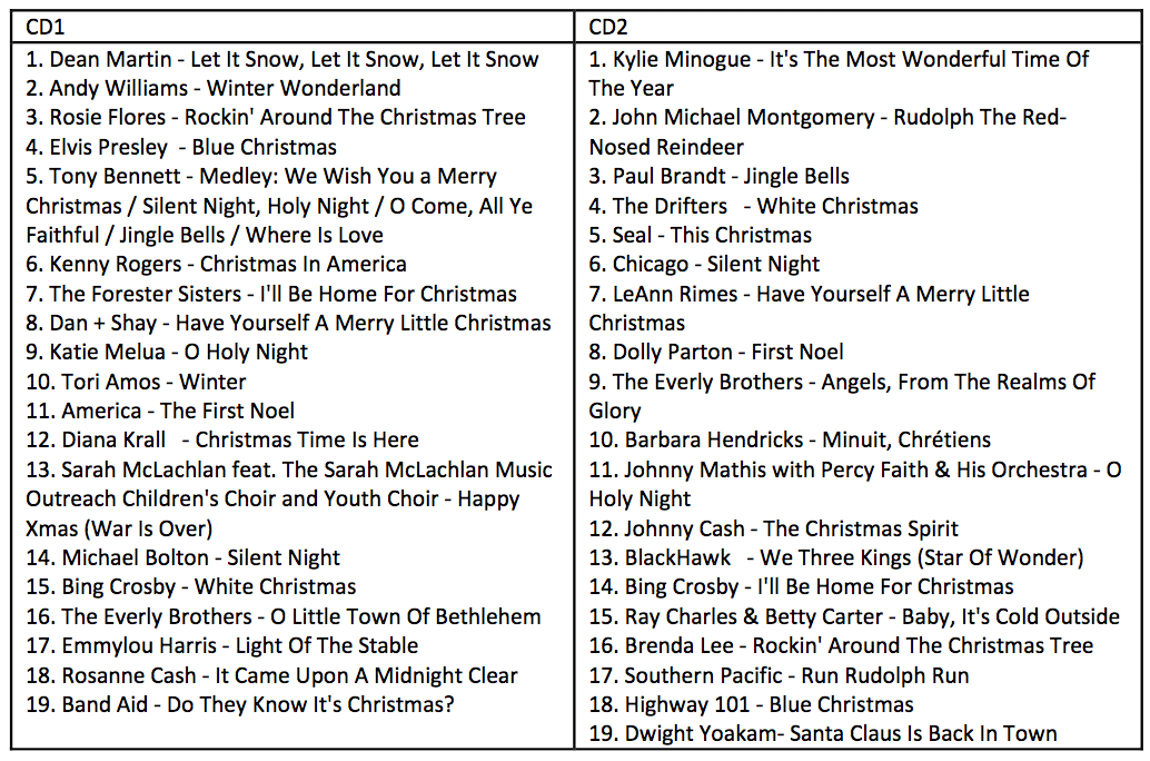 "Let it Snow !" par Dean Martin, "Blue Christmas" et "Silent Night" chantés par Elvis Presley, "We wish you a merry Christmas" suivi d'un medley de Noël dans la voix de Tony Bennett, "Do they know it's Christmas" du Band Aid. La liste des artistes est impressionnante.