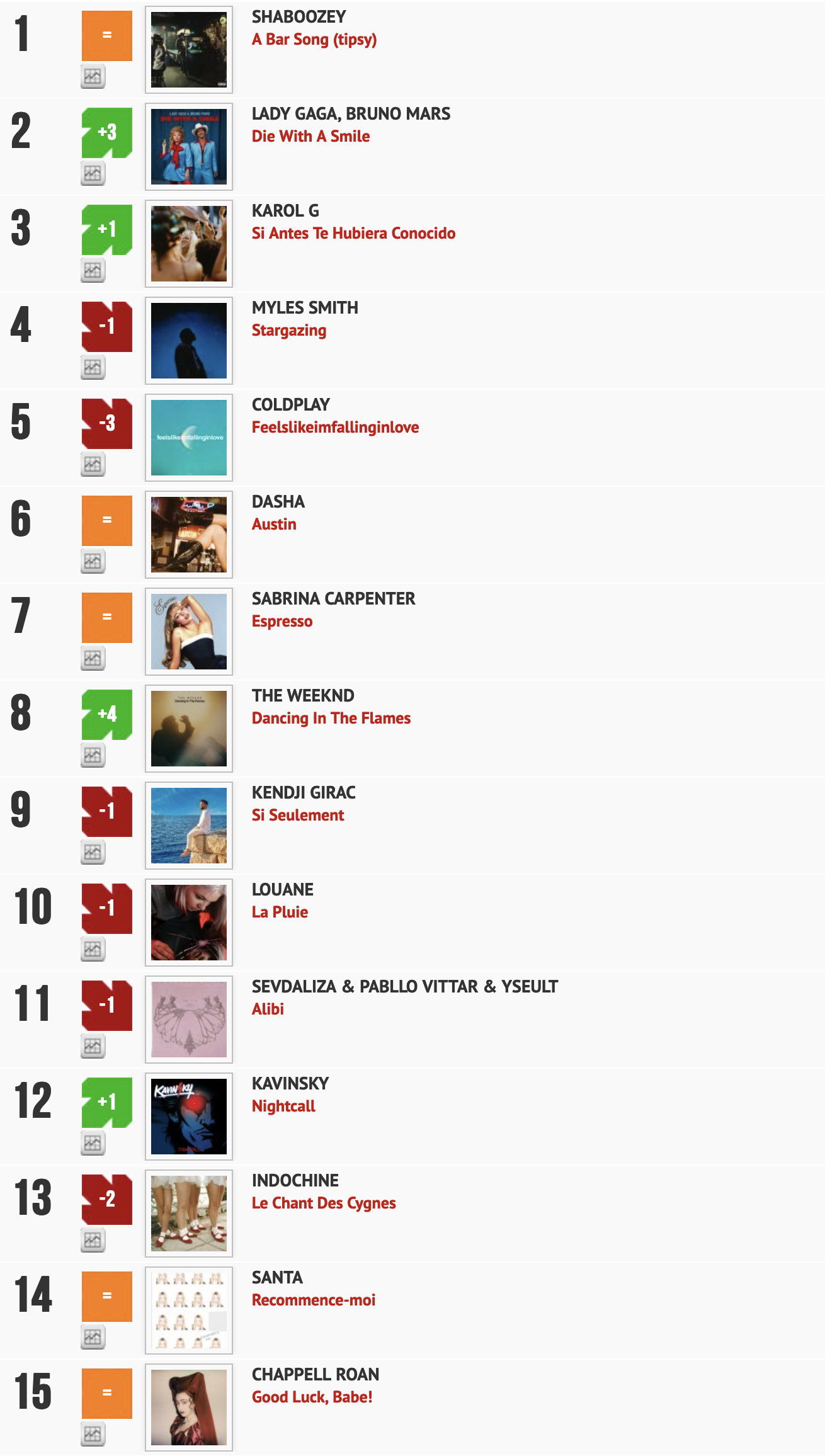 Calculé à partir des diffusions sur plus de 200 radios, l'intérêt et l'originalité de ce nouveau classement c'est surtout qu'il ne prend pas en compte l’audience des radios. "Un programmateur = 1 voix", ce qui donne ici un avantage à l’humain sur la machine et les algorithmes. Un classement en partenariat avec La Lettre Pro de la Radio...Découvrez la suite du classement Radio Buzz 40 - La Lettre Pro du 19 octobre 2024 et les autres titres ICI. Également disponibles, la "Meilleure entrée, la "Meilleure progression" et, forcément, la plus "grosse gamelle" de la semaine. Brulhatour est le rédacteur en chef du magazine La Lettre Pro de la Radio et le directeur associé... En savoir plus sur cet auteur