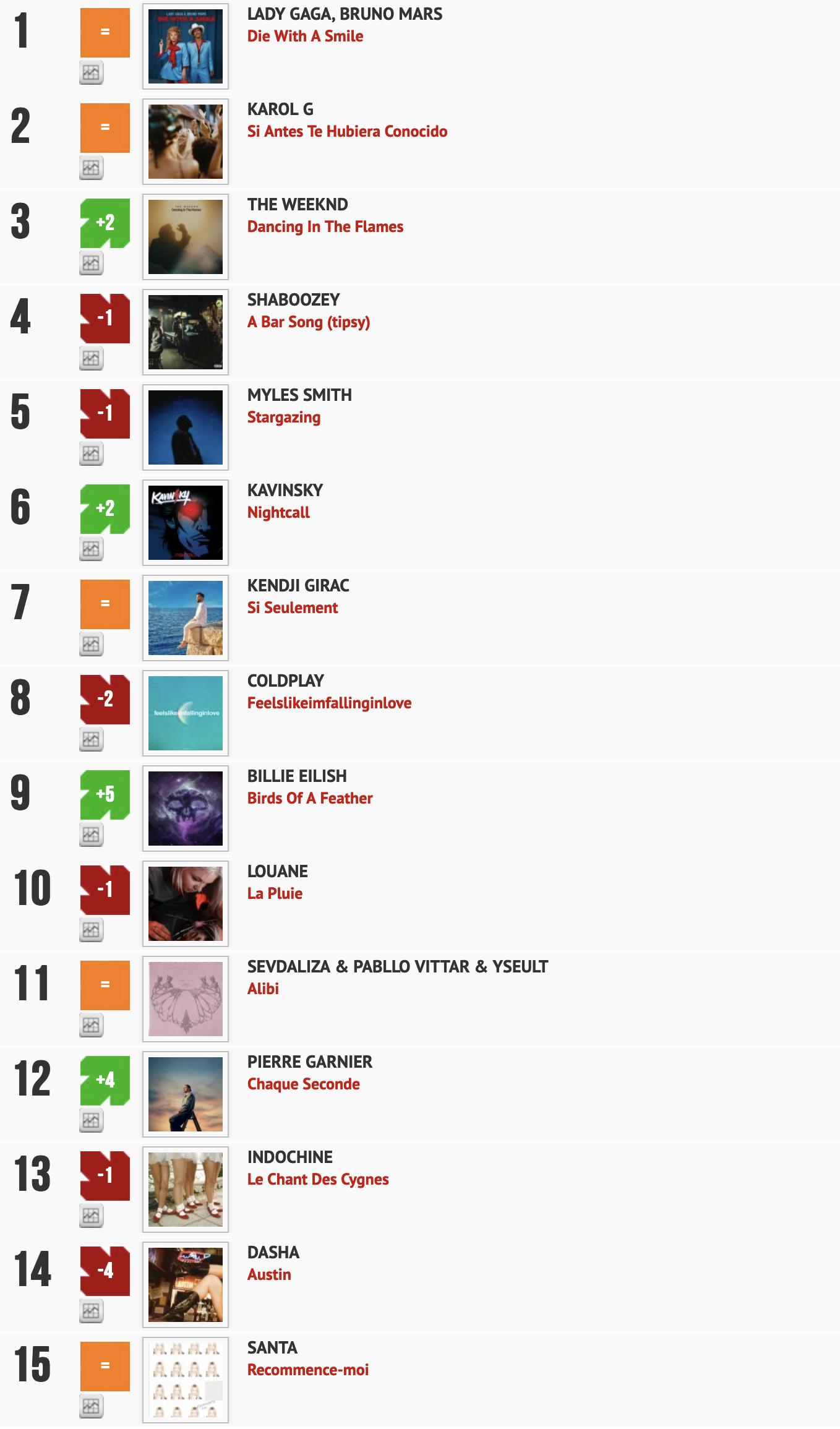 Calculé à partir des diffusions sur plus de 200 radios, l'intérêt et l'originalité de ce nouveau classement c'est surtout qu'il ne prend pas en compte l’audience des radios. "Un programmateur = 1 voix", ce qui donne ici un avantage à l’humain sur la machine et les algorithmes. Un classement en partenariat avec La Lettre Pro de la Radio...Découvrez la suite du classement Radio Buzz 40 - La Lettre Pro du 02 novembre 2024 et les autres titres ICI. Également disponibles, la "Meilleure entrée, la "Meilleure progression" et, forcément, la plus "grosse gamelle" de la semaine. Brulhatour est le rédacteur en chef du magazine La Lettre Pro de la Radio et le directeur associé... En savoir plus sur cet auteur