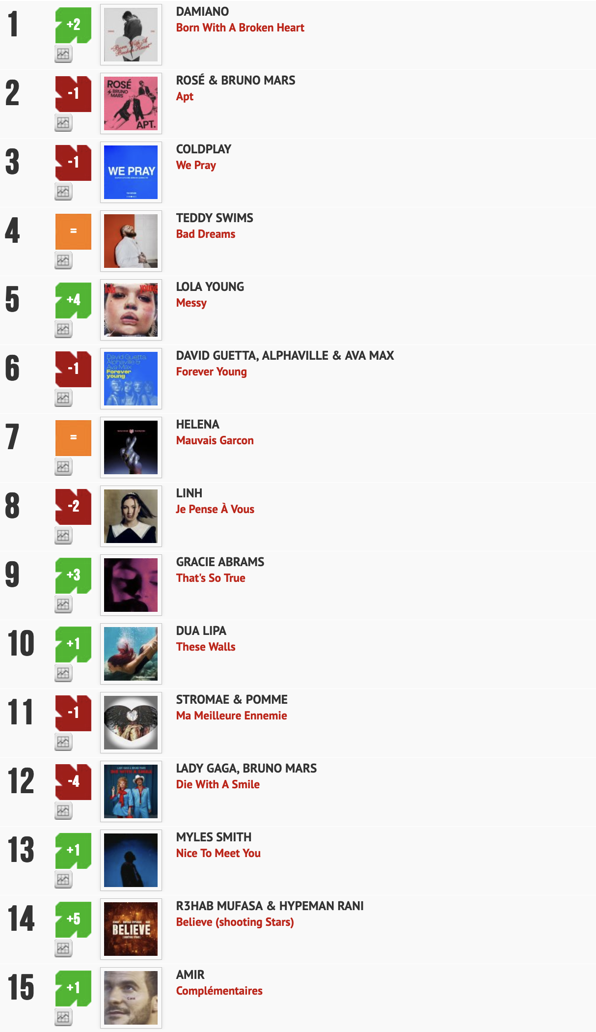 Calculé à partir des diffusions sur plus de 200 radios, l'intérêt et l'originalité de ce nouveau classement c'est surtout qu'il ne prend pas en compte l’audience des radios. "Un programmateur = 1 voix", ce qui donne ici un avantage à l’humain sur la machine et les algorithmes. Un classement en partenariat avec La Lettre Pro de la Radio...Découvrez la suite du classement Radio Buzz 40 - La Lettre Pro du 21 février 2025 et les autres titres ICI. Également disponibles, la "Meilleure entrée, la "Meilleure progression" et, forcément, la plus "grosse gamelle" de la semaine. Brulhatour est le rédacteur en chef du magazine La Lettre Pro de la Radio et le directeur associé... En savoir plus sur cet auteur