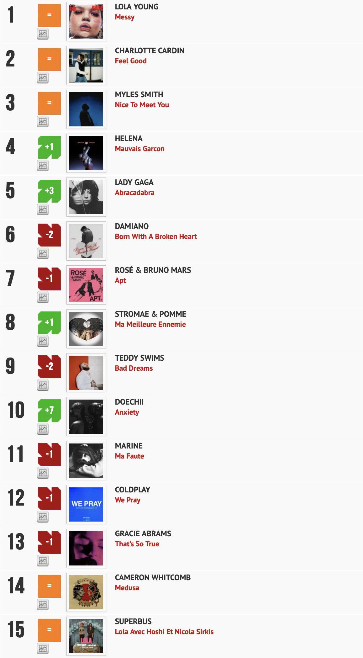 Calculé à partir des diffusions sur plus de 200 radios, l'intérêt et l'originalité de ce nouveau classement c'est surtout qu'il ne prend pas en compte l’audience des radios. "Un programmateur = 1 voix", ce qui donne ici un avantage à l’humain sur la machine et les algorithmes. Un classement en partenariat avec La Lettre Pro de la Radio...Découvrez la suite du classement Radio Buzz 40 - La Lettre Pro du 12 avril 2025 et les autres titres ICI. Également disponibles, la "Meilleure entrée, la "Meilleure progression" et, forcément, la plus "grosse gamelle" de la semaine. Brulhatour est le rédacteur en chef du magazine La Lettre Pro de la Radio et le directeur associé... En savoir plus sur cet auteur