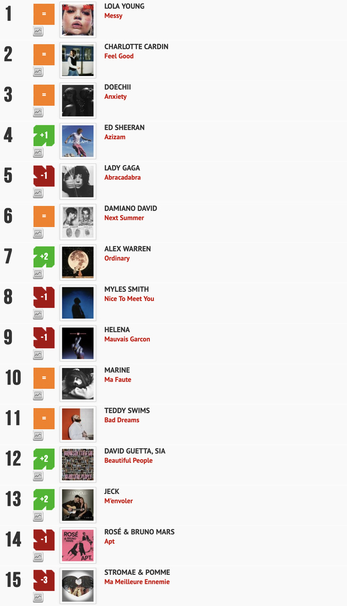 Calculé à partir des diffusions sur plus de 200 radios, l'intérêt et l'originalité de ce nouveau classement c'est surtout qu'il ne prend pas en compte l’audience des radios. "Un programmateur = 1 voix", ce qui donne ici un avantage à l’humain sur la machine et les algorithmes. Un classement en partenariat avec La Lettre Pro de la Radio...Découvrez la suite du classement Radio Buzz 40 - La Lettre Pro du 17 mai 2025 et les autres titres ICI. Également disponibles, la "Meilleure entrée, la "Meilleure progression" et, forcément, la plus "grosse gamelle" de la semaine. Brulhatour est le rédacteur en chef du magazine La Lettre Pro de la Radio et le directeur associé... En savoir plus sur cet auteur