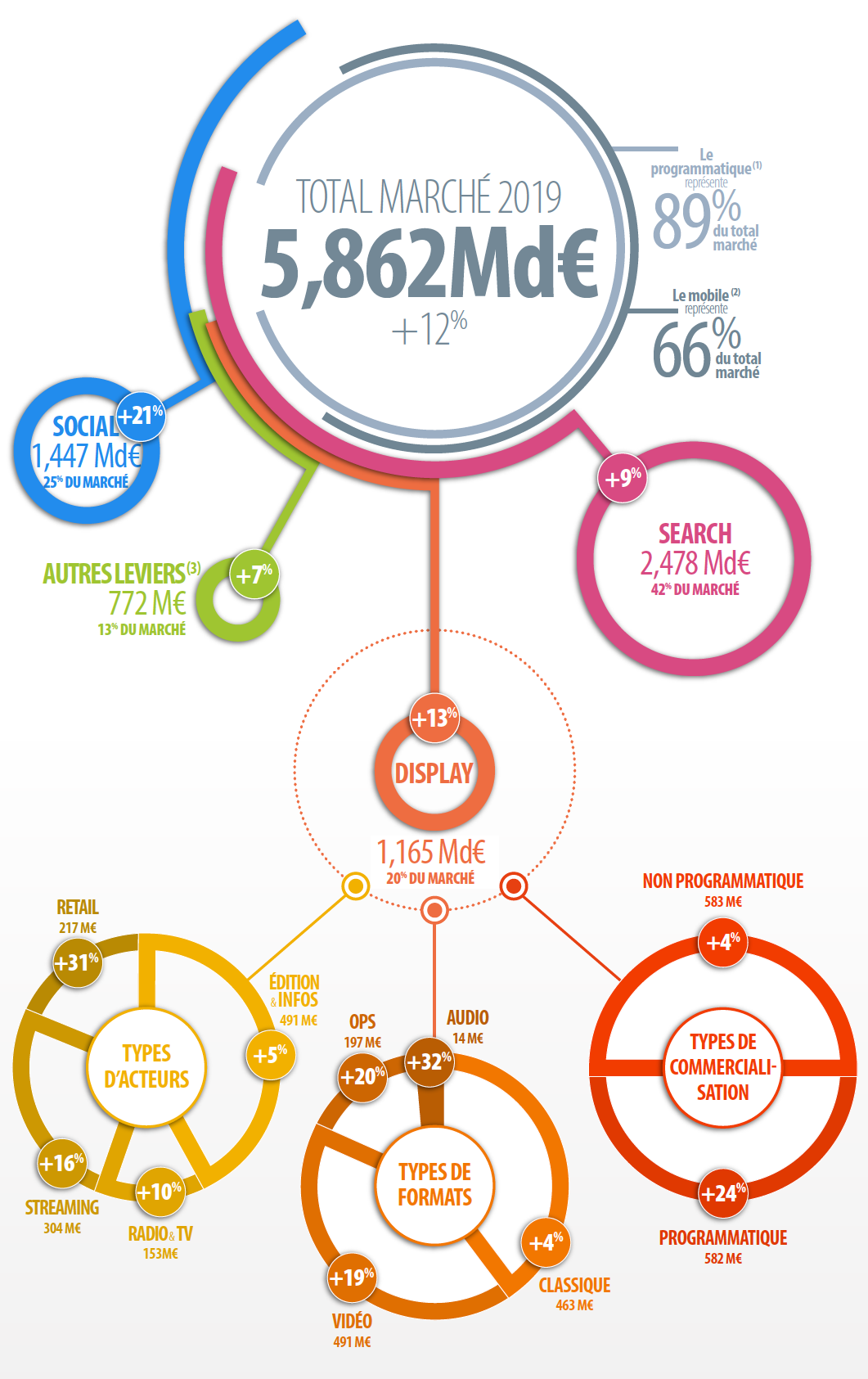 Les recettes publicité digitale en France augmentent de 12% en 2019 pour atteindre 5 862 M€. Tous les leviers progressent : le Search : (+ 9%) qui représente 42% du marché et reste le levier le plus important (2 478 M€) dont 63% des recettes Search réalisées sur Mobile ; le Retail Search est en croissance de 39%, pour représenter 7.7% du Search. Le Social qui représente 25% du marché, c’est le 2e levier de la pub digitale (1 447 M€) et c’est aussi la plus forte croissance malgré un important ralentissement : la croissance a été divisée par 3 par rapport à 2018. Le Display avec +13% et qui représente 20% du marché (1 165 M€), cette croissance globale recouvre des dynamiques très contrastées. Enfin, les autres leviers avec une croissance de 7% et qui représentent une part de marché de 13%, soit