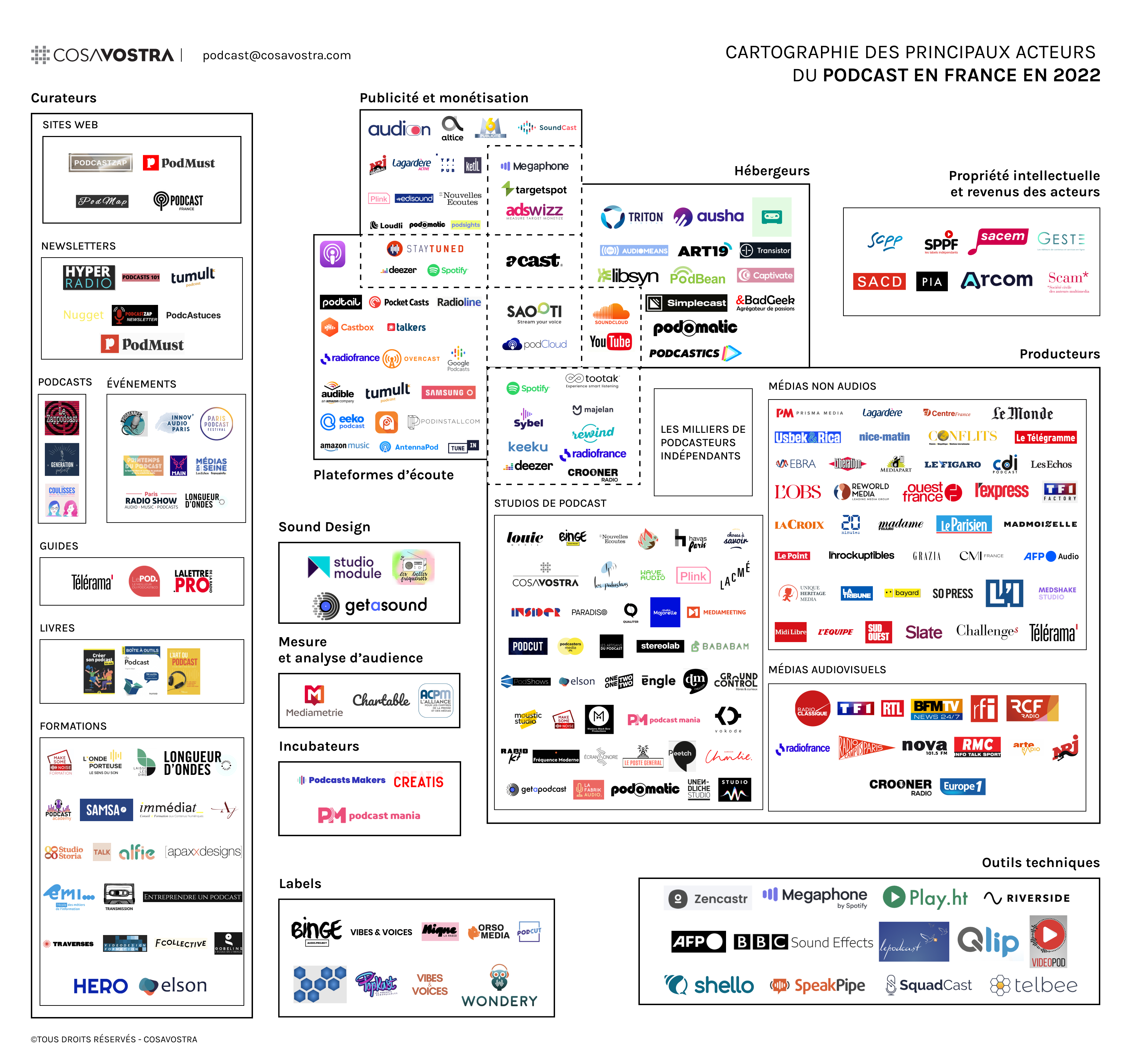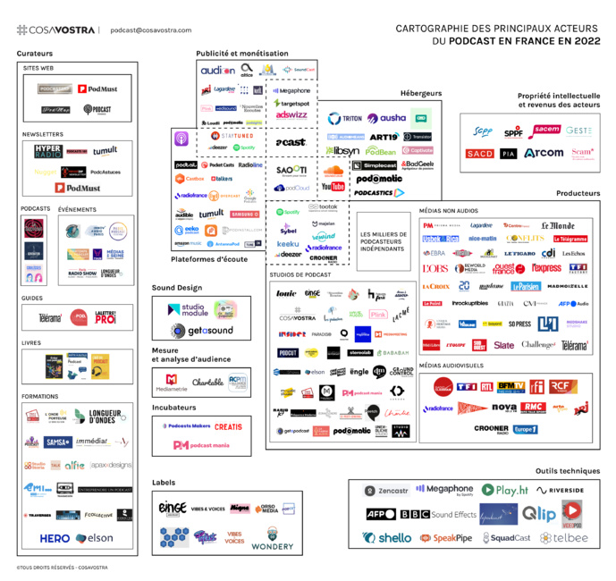 Dans cette cartographie, publiée pour la quatrième année consécutive, CosaVostra a mis un point d’honneur à répertorier les principaux acteurs du podcast en France. Une nouvelle édition actualisée, réorganisée et augmentée avec de nouvelles catégories telles que les outils techniques, les labels, les livres et les formations.Brulhatour est le rédacteur en chef du magazine La Lettre Pro de la Radio et le directeur associé... En savoir plus sur cet auteur