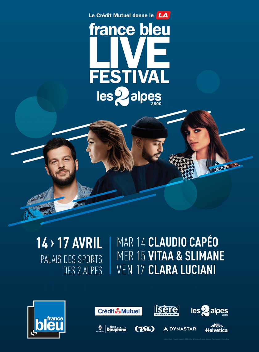 France Bleu et la station des 2 Alpes tiennent chaleureusement à remercier leurs partenaires ainsi que Claudio Capéo, Vitaa, Slimane, Jean-Louis Aubert et Clara Luciani qui ont répondu présents pour le France Bleu Live Festival et leur donnent rendez-vous prochainement.