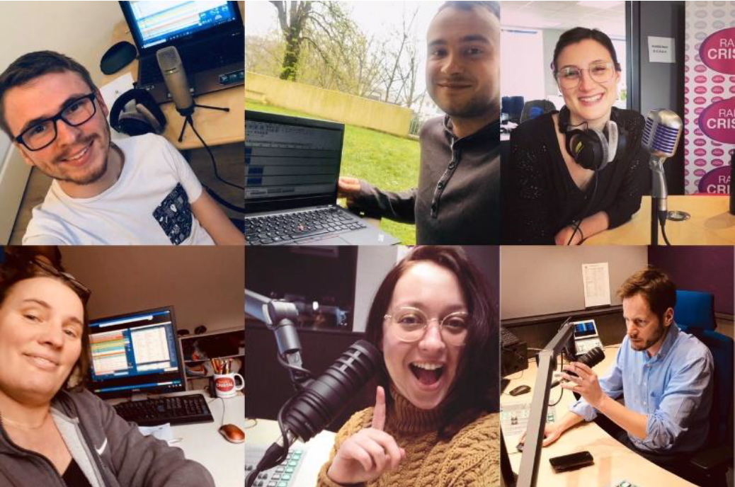 En-haut : Corentin (animateur 16h-20h), Clément (journaliste), Julie (journaliste). En-bas : Jocelyne (réalisatrice), Aurélie (animatrice 12h-16h) et Samuel (directeur des programmes)