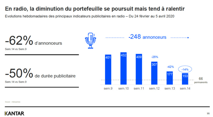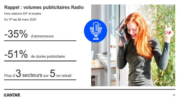 Une lueur au bout du tunnel ? Après avoir été laminé par la crise sanitaire, le média radio ralentit sa chute, selon les données de Kantar qui mesure, semaines après semaines, les impacts du Covid-19. "La radio semble renverser la vapeur avec un ralentissement de la baisse de son portefeuille et une reprise de la pression publicitaire" a souligné Zaïa Lamari, data analyst Kantar au cours d'un webinar ce mercredi matin. "Les radios d'Ile-de-France déjà en baisse avant la crise sont les plus touchées ainsi que les musicales". Néanmoins, le nombre d'annonceurs sur le média reste historiquement bas à 153, en baisse de 62% entre le 30 mars et 5 avril par rapport à la semaine du 24 février au 1er mars, et une chute de 50 % de la durée publicitaire. Le ralentissement est moins fort sur les deux dernières semaines, avec une baisse de 14%.