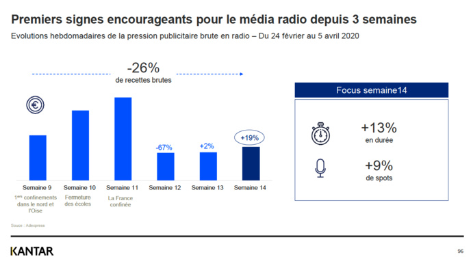 Le média semble bénéficier d'un rebond des recettes brutes, avec une hausse de 19% sur la semaine 14 (30 mars - 5 avril) par rapport à la semaine précédente. L'indicateur reste en forte baisse de 26% depuis le début de la crise et des premières mesures de confinement. Sur cette même semaine 14, les durées et nombre de spots ont repris des couleurs en hausse de 13% et 9% respectivement.