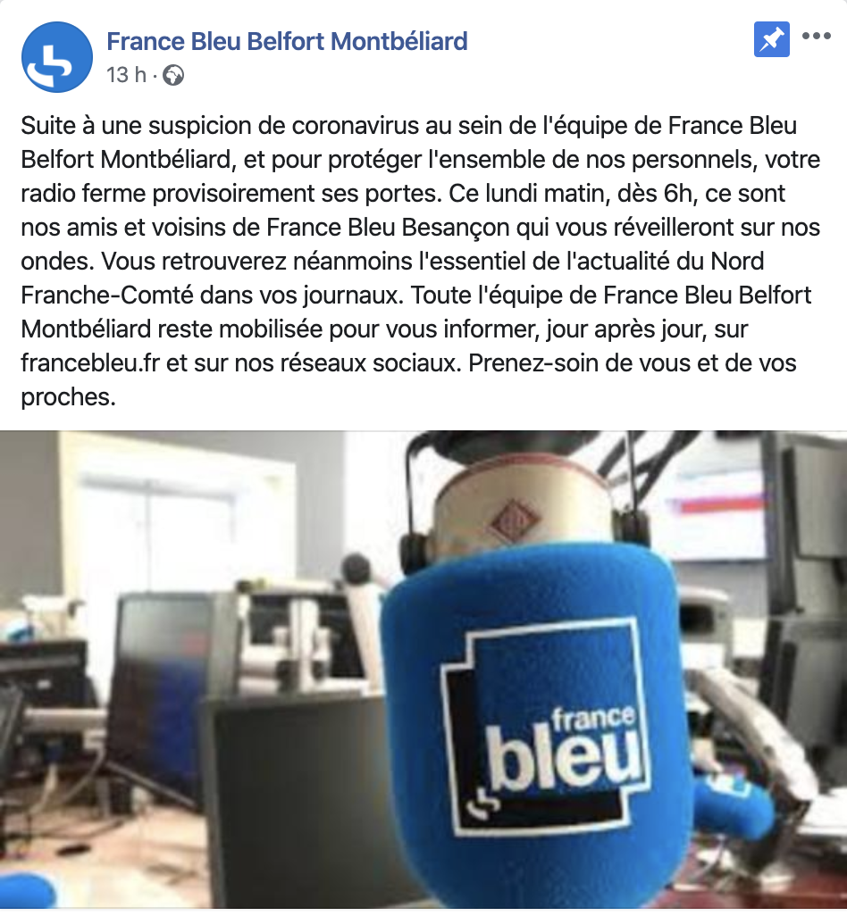 L'Est de la France est particulièrement touchée par l'épidémie de Coronavirus et cela n'échappe pas aux stations de radio. Un cas étant suspecté au sein de l'équipe de France Bleu Belfort Montbéliard, la station a été fermée ce week-end "pour protéger l'ensemble de nos personnels, votre radio ferme provisoirement ses portes" peut-on lire sur la page Facebook de la station locale de Radio France. Depuis ce lundi matin, les programmes de la station voisine France Bleu Besançon ont pris le relais. "Vous retrouverez néanmoins l'essentiel de l'actualité du Nord Franche-Comté dans vos journaux" indique la station.
